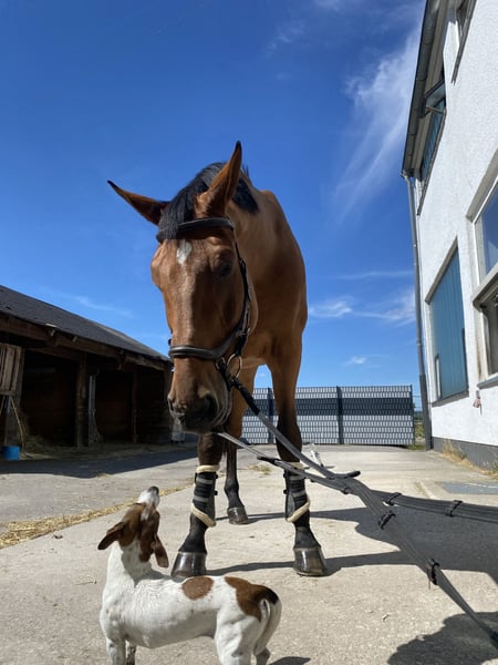 A la venta mi caballo de 17 años, que aporta muchos años de experiencia y ahora busca a una persona que valore un compañero confiable y un maestro honesto — no es un caballo de deporte, sino un caballo para el corazón. En tierra, es extremadamente trabajador, atento y confiable — casi como un perro. Bajo la silla, es muy sensible, responde finamente a las ayudas y transmite una sensación de equitación fantástica. Puede ser montado con facilidad 3-4 veces por semana y todavía disfruta de pequeños saltos, sin presión por rendimiento. 🤍 Carácter y comportamiento social Le encantan los perros, es muy compatible con otros caballos (especialmente yeguas) y está acostumbrado a la vida en manada. Debido a su artrosis, debe seguir en un paddock libre, lo cual le hace mucho bien. 🌦️ Salud y manejo En cambios de clima, se le puede apoyar con Harpagofito. Con un entrenamiento adaptado, movimiento y buena higiene, es un compañero de ocio y enseñanza absolutamente fiable. 👤 ¿Para quién es adecuado? • Jinetes de hasta 70 kg • Ideal para personas tranquilas, que montan con delicadeza, reincorporados o jinetes de ocio ambiciosos • Alguien que valore el aprendizaje, la sensibilidad y la asociación 🐎 Prueba de montura y acompañamiento Es posible una prueba de monta de 30 € (en cercanía). También puede seguir entrenando conmigo, acompañando muy conscientemente la transición. ✨ Importante Este caballo se entregará únicamente a manos muy responsables. No busca trabajo, sino a una persona que quiera un maestro leal y un amigo para toda la vida.