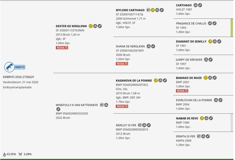 Embryo implanté – Perspective Grand Prix (1,60 m) Dexter de Kerglenn × Winefolly K van Katteheye Wij bieden één reeds geïmplanteerd embryo aan, uitsluitend bedoeld voor topsport op het hoogste niveau (1,60 m / Grand Prix). ???? Vader: Dexter de Kerglenn – bewezen sportgenen, kracht en bereik ???? Moeder: Winefolly K van Katteheye – gerenommeerde vrouwelijke lijn BWP 34 – nauwe connectie met de familie Sea Coast Ferly / Narcotique de Muze II – lijn wereldwijd bekend om Grand Prix-niveau springpaarden ???? Status: geïmplanteerd embryo (ET) ???? Registratie: Horsetelex – volledige traceerbaarheid ???? Profiel: puur sportief – kracht, sprongbereik, rijbaarheid ???? Voordeel: verminderd risico dankzij het reeds geïmplanteerde embryo ???? Verwachte geboortedatum: 14-05-2026 Dit genetisch materiaal is ideaal voor: professionele sportstallen programma’s gericht op internationale sport sportinvesteerders die kwaliteit boven kwantiteit verkiezen ???? Details en volledige presentatie op aanvraag beschikbaar. DeSau Stables Sp. z o.o. Premium Sport Horse Breeding Polen – België