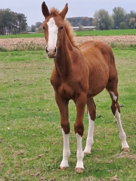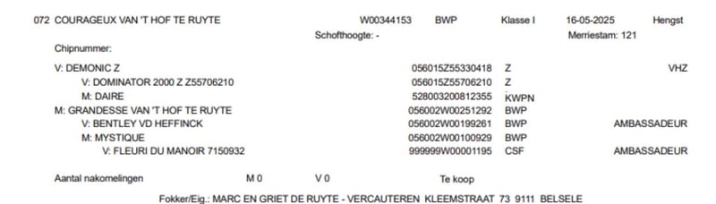 Puledro maschio in vendita – Linea di sangue prestazionale BWP 121 Un promettente puledro maschio proveniente da una consolidata linea di sangue prestazionale BWP 121, con una genealogia eccezionale: Demonic Z x Bentley vd Heffinck x Fleuri du Manoir. Questo cavallo di colore baio ha una bella stella bianca e una distintiva macchia bianca sulla pancia. È molto dolce e mansueto, con un carattere piacevole – ideale per un ulteriore sviluppo in ambito sportivo. La madre ha gareggiato fino a livello 1,30 m ed è originaria di una famiglia forte, con diversi cavalli di alto livello: Saphir – salto fino a 1,60 m Mic Mac du Dieu Demon – 1,50 m Valesco – cavallo da internazionale di salto ostacoli Duchesse van ’t Hof te Ruyte e Jolie van ’t Hof te Ruyte – entrambi 1,30 m Indigo van ’t Hof te Ruyte – 1,40 m Inoltre, la madre è una mezza-sorella di Saphir, il che rende questo puledro ancora più interessante per lo sport di salto. In breve: un giovane cavallo di qualità con potenziale per competere ai livelli più alti.