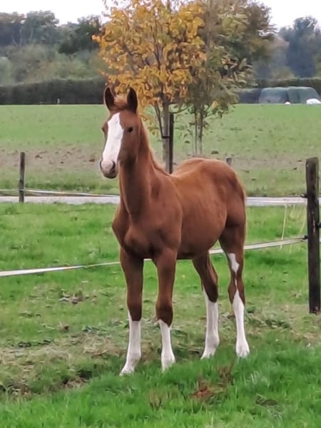 Jaarling hengst te koop – BWP prestatiestam 121 Beloftevolle jaarling hengst uit een bewezen BWP prestatiestam 121, met een uitzonderlijke bloedlijn: Demonic Z x Bentley vd Heffinck x Fleuri du Manoir. Deze voskleurige hengst heeft een mooie witte bles en een opvallende witte vlek op de buik. Hij is zeer lief en braaf in de omgang, met een aangenaam karakter – ideaal voor verdere opleiding in de sport. De moeder sprong zelf op 1.30-niveau en komt uit een sterke familie met meerdere toppaarden: Saphir – sprong op 1.60-niveau Mic Mac du Dieu Demon – 1.50 Valesco – internationaal eventingpaard Duchesse van ’t Hof te Ruyte en Jolie van ’t Hof te Ruyte – beide 1.30 Indigo van ’t Hof te Ruyte – 1.40 De moeder is bovendien een halfzus van Saphir, wat deze hengst extra interessant maakt voor de springsport. Kortom: een kwaliteitsvol jong paard met potentieel voor de hogere sport.