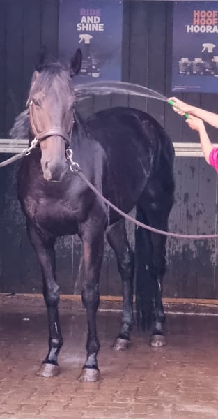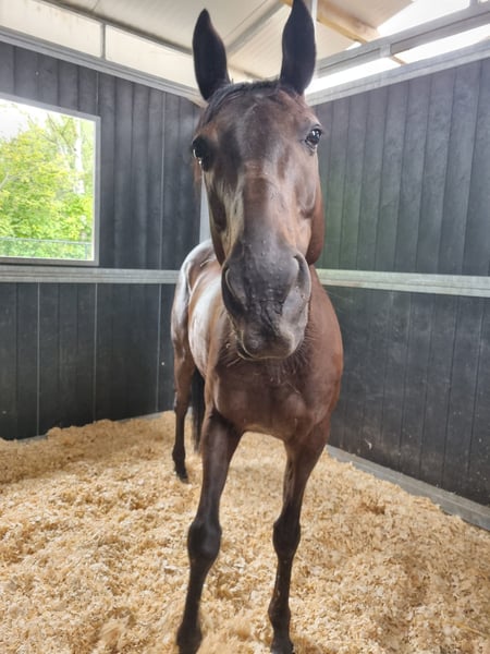 Name: Azooz Age: 9 years Gender: Gelding Color: Black Height: 15.5 hh Azooz is a handsome, intelligent, and eager-to-learn gelding with a kind nature and a pleasant work attitude. He already knows many dressage exercises such as lateral movements, shoulder-in, travers, counter, flying changes, and walk-trot transitions, and he quickly and happily masters new exercises. Besides work in the arena, Azooz also enjoys outdoor rides — he is happy to go alone or with other horses and is reliable and attentive (preferably in front in a group). He approaches jumping with enthusiasm; he easily jumps a 1.00 m course and, with an experienced rider, can also handle 1.10 m to 1.15 m. Azooz has some blood and energy, making him unsuitable for beginner riders. He performs best with a confident and experienced rider who understands and appreciates his temperament. Over the past three years, he has completed rider training with me, developing into a reliable, versatile, and enjoyable partner to ride. In short: Azooz is a charming, honest, and willing horse who has much to offer an ambitious rider looking for a good partner to grow with — in dressage, jumping, and recreational riding (soundness exam available upon request).