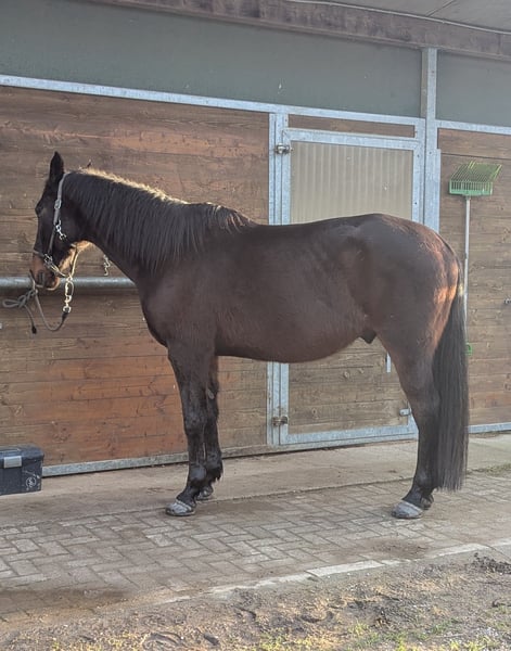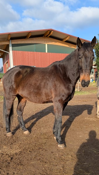 People-oriented, intelligent gelding seeking a permanent home Diamond is an 11-year-old Irish Sport Horse gelding, standing approximately 16.1 hh. He is very affectionate towards people and enjoys interaction and attention. He feels most comfortable and has the most fun in the outdoor environment. An excellent adventure buddy! He is well-behaved under saddle on the arena, though riding there is not his favorite activity. He enjoys groundwork and makes an effort to respond to commands. His playful personality makes him a joy to be around—a real charmer. He is best suited for one or two riders; he does not get along well with changing handlers or riders. He requires turnout in a pasture with a herd. Keeping him stabled, even with turnout, tends to make him anxious and easily spooked. In a harmonious herd environment, these issues are not noticeable. Currently, he is shod with oil-lathed shoes on all four feet. I have also previously kept him barefoot at the back. However, due to the hard surfaces in the turnout, he quickly wears down his hooves and becomes tender-footed. He has developed equine asthma and shows two minor arthritic changes, which do not limit him. The asthma is currently moderate. With an appropriate stable environment, it should be manageable, and he will likely become symptom-free. I am offering him for sale because I cannot find a suitable stable nearby that can accommodate his asthma, as he tends to start coughing and produce some mucus periodically. He is vaccinated against tetanus and regularly dewormed. Further detailed information is available by phone. We also welcome a personal visit. I have grown very fond of him and wish for him to find a home where he can settle in and fully express his wonderful personality. Not a rescue sale; no riding schools or dealers. Accessories: Inhaler, rain, fly, and cooling sheets, halter, bridle, bitless bridle, etc., can be purchased with him.