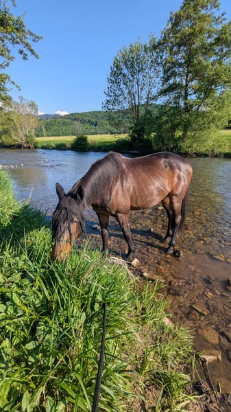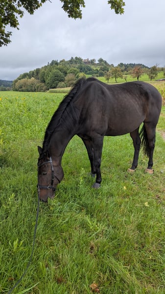 Traum-Charakter sucht Endplatz Wegen Aufgabe des Reitsports sucht Diamond ein neues Zuhause. Er ist ein super toller Freizeitpartner! Sensibel, freundlich, motiviert bei der gemeinsamen Arbeit. Geboren 2014 und ca 1.70 Stk. Er liebt die Haltung in der Herde und so viel Auslauf wie nur möglich. Aktuell lebt er in einem Offenstall in einer Wallachgruppe. Zeigt sich hier verspielt, sehr sozial und nett (rang mittig). Er freut sich, wenn er eine feste Bezugsperson hat. Sein Reiter sollte fein und einfühlsam sein. In der Bodenarbeit macht er super mit. Durch seine sensible Art wahnsinnig fein über Körpersprache und Energie zu lenken. Er liebt Spaziergänge und Geländeritte und ist bei jedem Abenteuer durch die Natur dabei. Momentan 4 Fach beschlagen. Regelmäßig Tetanus geimpft, Zähne zuletzt Ende Mai 2025 gemacht. Im letzten Jahr hat er Equines Asthma entwickelt. Mit bedampftem/gewaschenem Heu und angepasstem Stallklima sollte das keine Symptome mehr verursachen. Ich wünsche mir für ihn einen Endplatz, wo genug Zeit vorhanden ist, um ihm die Aufmerksamkeit zu schenken, die er verdient hat und ein festes Familienmitglied sein darf. Weiteres gerne in einem Telefonat und persönlichem Kennenlernen. Gesamtes Zubehör kann gerne mit erworben werden. (Inhalator, Regen-, Fliegen-, und Abschwitzdecken, Halfter, Trense, Kappzaum, Reitpad, Schabracken, etc.) Kein Notverkauf, keine Händler oder Reitschulen.