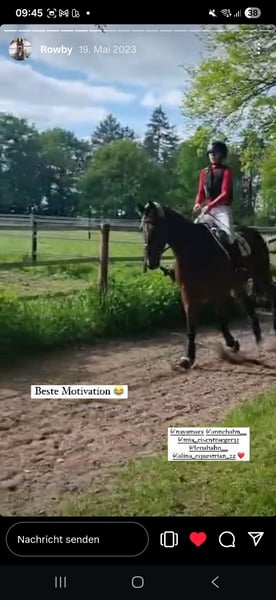 Il nostro Rowby ha dovuto interrompere la sua carriera nella scuola di equitazione, poiché dopo un intervento ai tendini e trattamenti con onde d'urto non è più in grado di sostenere sforzi intensi. È socievole, in ottima salute, con ferrature anteriori, ed è naturalmente vaccinato e sverminato. Rowby ha bisogno del suo proprietario e di spazio sufficiente. È possibile fare passeggiate a mano.