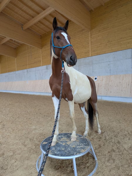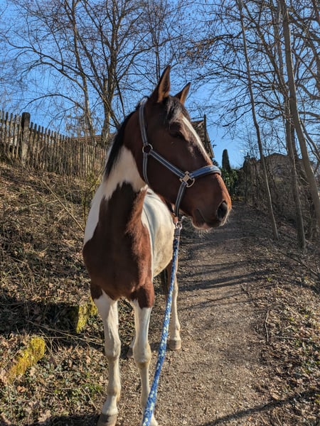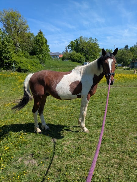 Wir verkaufen unseren 4 jährigen, Braunscheck Wallach Loki. Er ist ca. 155cm groß. Anfang März 2025 haben wir ihn angeritten gekauft und ihm nochmal aufgrund seines Alters und seinem körperlichen Zustand eine Reitpause gegeben. In der Zeit wurde er longiert, auch über Stangen und Cavalettis, haben Bodenarbeit und Freiarbeit gemacht. Ich hatte ihn als Handpferd dabei und war auch mit ihm Spazieren. Er ist sehr unerschrocken und geht auch alleine ins Gelände. Seit Mitte November habe ich langsam begonnen ihn im Gelände Schritt und Trab zu reiten. Er läuft Barhuf und ist sehr brav beim Hufe bearbeiten. Er zeigt sich bei allem immer sehr bemüht und hat einen freundlichen Charakter. Loki ist dem Menschen sehr zugewandt und möchte gearbeitet werden. Bei uns steht er in einer gemischten Herde im Offenstall, das funktioniert sehr gut. Wer also ein freundliches, aufgeschlossenes Pferd sucht zum selbst ausbilden, ist bei ihm genau richtig. Bei Interesse bitte melden.