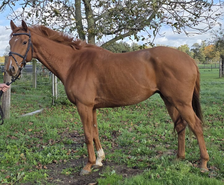 Sandmason is a approximately 1.65 m tall Irish gelding. He has been in Germany for a few weeks. In his homeland, he was lightly backed this year and was allowed to grow and mature in the herd first. Therefore, Sandmason is still completely unspoiled. With us, he is being lunged frequently to build muscle, which is progressing well. He is increasingly moving forward. Sandmason is already walking, trotting, and cantering under saddle, although he is still a bit unbalanced in these gaits. For this reason, he is not suitable as a beginner's horse. In handling, he is very sweet and calm. He still needs some training in hoof handling. Otherwise, he is a confident horse who is used to growing up in the herd, has always loaded well, and gets along very well with other horses. He is also accustomed to being outside 24 hours a day. A veterinary examination without findings is available. If you are interested or want more information, we look forward to your call at: 0177/2721831.