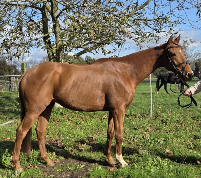 Sandmason es un caballo irlandés de aproximadamente 1,62 m de altura. Lleva unas semanas en Alemania. En su país de origen, fue iniciado suavemente en la doma este año, y primero pudo crecer y madurar en la manada. Por ello, Sandmason sigue siendo completamente inexperto. Aquí lo trabajamos mucho en la cuerda para que desarrolle musculatura, y ya estamos viendo buenos progresos. Cada vez se suelta más. Sandmason ya camina, trota y galopa bajo la silla, aunque todavía algo desequilibrado en sus movimientos. Por eso, no se vende como caballo para jinetes principiantes. En su carácter, es muy dulce y tranquilo. Sin embargo, aún necesita algo de entrenamiento en la entrega de las patas. Por lo demás, es un caballo confiado, acostumbrado a crecer en libertad, siempre ha entrado bien en el remolque y se lleva muy bien con otros caballos en la manada. También está acostumbrado a estar 24 horas al aire libre. Ya se ha realizado un examen veterinario sin hallazgos relevantes. Para más información o si están interesados, estaremos encantados de recibir llamadas al: 0177/2721831.