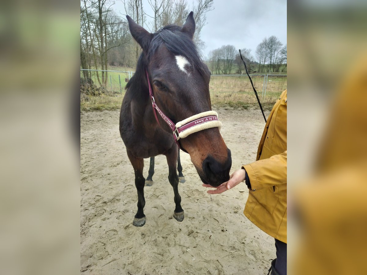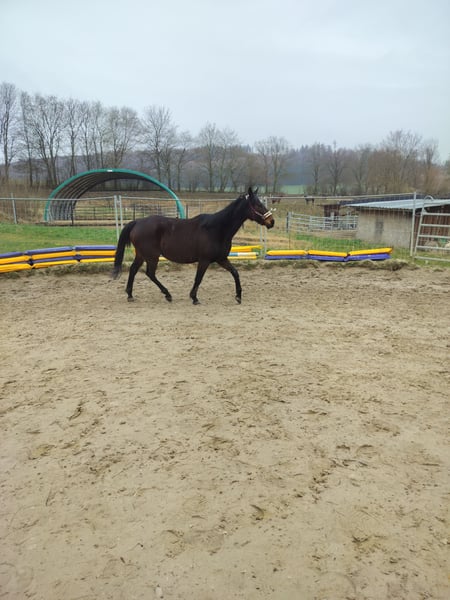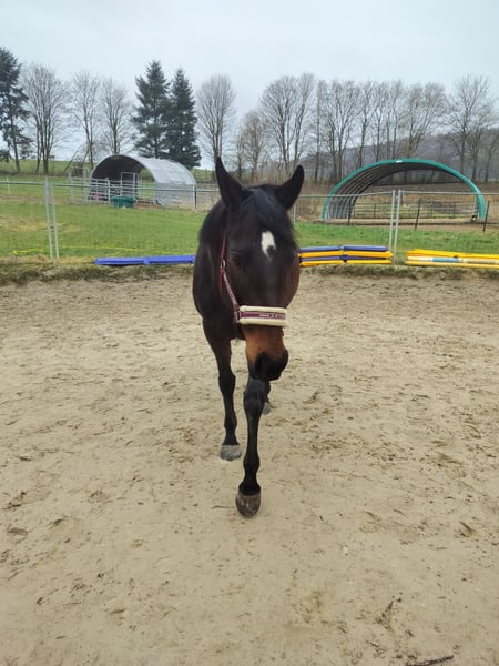 Listed for a friend. Sweet, affectionate mare. Well-behaved in handling, forging and loading are no problem. Lower in the hierarchy, lives in an open stable. Has been used for breeding in the past; overall, she has been ridden three times. She is a self-starter with good potential. With further training, she will surely become a lovely leisure horse. Not spooky. Unfortunately, she is currently poorly muscled. A drawback: she weaves in the stable but not in the pasture. Regrettably, due to personal reasons, she is being sold into good hands.