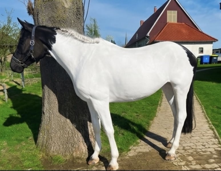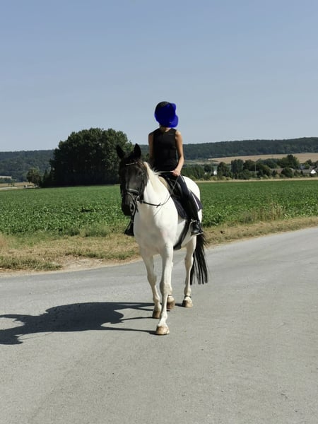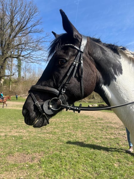 For sale on behalf of the owners. Unfortunately, due to personal reasons, we must part with our 10-year-old Irish Sport Horse mare. Orieo came to us from an unsuitable housing and training situation and has been carefully retrained by our 14-year-old daughter and our trainers. She is familiar with dressage work up to elementary level (including trot and canter extensions, lateral movements in walk and trot) and has experience riding with side reins in all basic gaits. She regularly trains over fences at other venues, but since she tends to become a bit hot in such situations, we focus on rhythmical, gymnastic jumping. She jumps up to elementary level and has also calmly completed courses with our beginner-jockey daughter at cross height. She has already explored some outdoor terrain and jumps over logs, is familiar with water crossings, as well as high and low jumps. She is safe at E-level and has jumped individual fences from A-distance. She is well-behaved when ridden alone or in a group and is familiar with road traffic before heading out onto field paths. She is easy to lunge, whether with or without side reins. Orieo is well-mannered and uncomplicated in handling. In some situations, she may be inexperienced and needs a calm but confident rider, but she handles such situations without issues. She is load and farrier friendly. Currently shod with four shoes, but due to our terrain, she is also comfortable barefoot. She is kept in a box stall with daily paddock turnout, and in summer, she has 24/7 pasture access. At the moment, she is in an open stall. Orieo is healthy, but has a sensitive stomach. We work with a pressure-distributing girth, and she has 24/7 hay available. Since starting this routine, she shows no further issues. She is regularly dewormed and vaccinated. Orieo is the perfect horse for an ambitious leisure rider who wants to grow with their horse and participate in clinics and training sessions. Although she has no competition experience yet, nothing stands in the way of that. Due to her training level, we do not sell her to beginners without proper support from a trainer. Because of her equestrian background, all accessories (Ikonic dressage saddle, 1 year old; Passier jumping saddle, 1 year old; bridle, girths, blankets, leg wraps, etc.) can be purchased at an additional cost. No dealers or riding schools, please. A viewing and trial ride fee of €30 applies, which will be credited upon purchase. Further photos, videos, and information gladly available via WhatsApp at 0176 42097320.