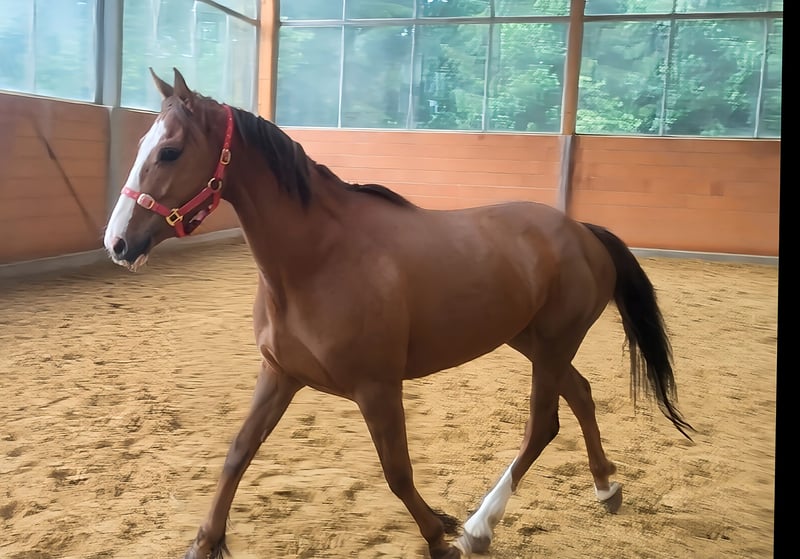 Cavalla di 3 anni, compatta, alta circa 162 cm, con potenziale meritevole di sviluppo. Di carattere stabile, ora può iniziare un'istruzione solida. Il trasporto può essere organizzato. È possibile effettuare un'ispezione veterinaria pre-acquisto anche tramite il proprio veterinario, inclusi raggi X e analisi del sangue. Si prega di contattare esclusivamente telefonicamente al numero 01774289729.