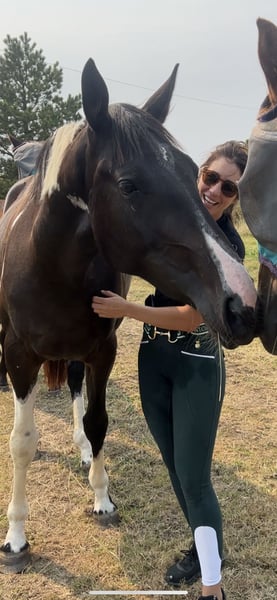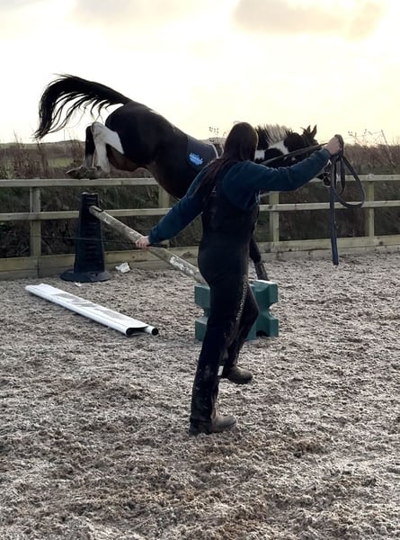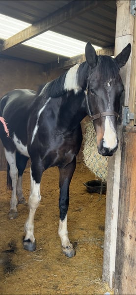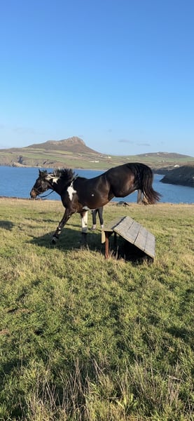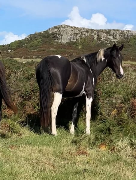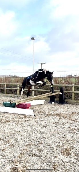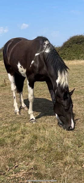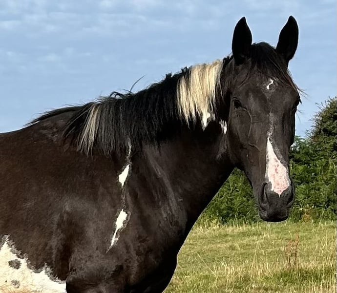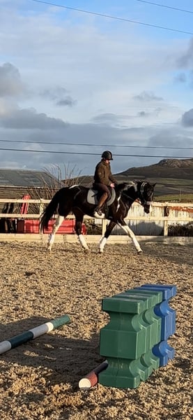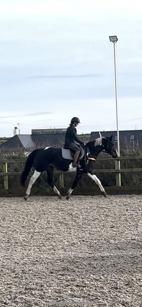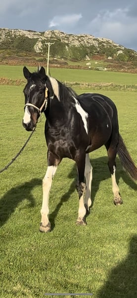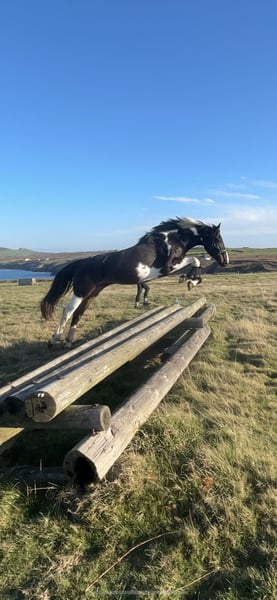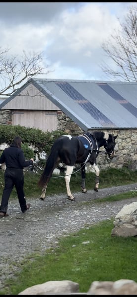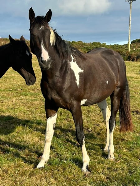 Absolutely divine 16.3hh 4yo Piebald Mare. By Russian Monarch / Glenhill Gold out of a Colin Diamond mare. A truly special young mare with all the attributes to make a top-class allrounder or competition prospect. She is such a quality mare and has the kindest temperament you could wish for. She has been lightly and correctly started, and showed maturity beyond her years. Before being turned away she hacked alone and in company. Worked in the school on 3 occasions in walk, trot and canter and loose jumped over some XC fences. She has natural balanced paces for a bigger horse, and showed a lot of jump ability. I can’t emphasise how honest, bold and straightforward she has been. She has such a lovely attitude and was so incredibly level headed with everything asked of her when she was backed. She has the brain and temperament to suit an amateur rider but the quality to progress further in the right hands too. Her temperament is second to none — genuinely one of the kindest, easiest mares you will ever meet. She is mannerly on the ground, willing under saddle, and just a pleasure to own. Only available due to personal circumstances — this mare is my absolute dream horse and this is a genuinely gutting decision.