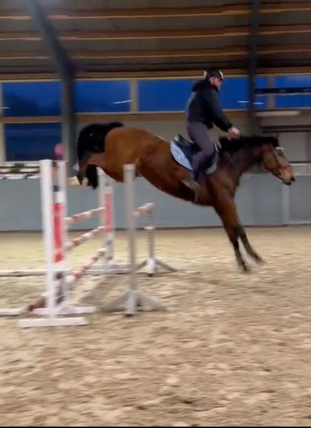 1m gewonnen- 6monate in Training. Jetzt 110cm. 8Monate ist er bei Reitbetailigung mit 15 Jahre alt Madchen. Haben wir leider kein Zeit. Im frei Sprung 150cm ist für ihn kein Problem. Unten Reiter gesprung einzeln Sprunge 120/130/140cm. Gesund und Problemlos Pferd. Jeden Tag lauft im Führemaschine und Koppel mit andere Pferde. Mehrere Videos/Infos gerne schicke ich per Whats App