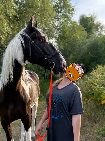 Dyngus (Pablo) - ein 2019 geborener polnischer Sportpferdewallach in der auffälligen und sehr schönen Farbe Rappschecke. Mit einem Stockmaß von etwa 1,70m sowie großrahmigen, harmonischen Gebäude deckt er auch große Reiter gut ab. Er verfügt über eine vollständige Abstammung, ist gesund und seine kleine Ankaufsuntersuchung vom Juni 2024 war ohne Befund. Aktuell ist er vierfach beschlagen, kann jedoch problemlos auch barhuf gehalten werden. Im täglichen Umgang zeigt sich Dyngus als außergewöhnlich lieber, freundlicher und menschenbezogener Wallach. Er ist ausgeglichen, neugierig, verschmust und lernt sehr schnell. Er verzeiht Reitfehler, lässt sich fein reiten und wird derzeit auch von einer Jugendlichen problemlos geritten. Dyngus ist zudem absolut unkompliziert: Er ist schmiede- und verladefromm sowie brav beim Tierarzt und Hufschmied. In der Herde ist er rangmittig und verträglich mit sowohl Stuten als auch Wallachen. Er lebt im Offenstall bzw. Laufstall und eine artgerechte Haltung mit viel Auslauf und Sozialkontakt wird für ihn weiterhin gewünscht. Unter dem Sattel besitzt er eine solide Grundausbildung. Er geht sicher in allen drei Grundgangarten sowie an der Hand und im Schritt Schenkenweichen / Seitengängen Vorder-/Hinterhandwendung, Rückwärtsrichten etc .Dyngus wird weiterhin gefördert, kennt einige Trail und Working Eqiutation Hindernisse(Brücke, Glockengasse,Tor, Stangenlabyrinth etc) .Er wird Englisch geritten, kennt aber auch den Westernsattel. Er verfügt über viel Geländeerfahrung ( auch in schwierigen + bergigem Gelände). Auch allein ist er souverän unterwegs. Zusätzlich hat er eine zweispännige Fahrausbildung erhalten. Es stellte sich heraus das Kutschefahren nicht seins ist und ihm Stress verursacht. Dies ist auch der EINZIGE Verkaufsgrund, da für die Besitzer aufgrund der eigenen Gesundheit Kutschefahren dem Reiten vorgeht. Ansonsten ist er ein vielseitig einsetzbares, talentiertes Pferd, das bereits an verschiedenen Kursen wie Dressur, Trail oder Working Equitation teilgenommen hat und mit Freude ins Wasser geht. Dyngus ist ein rundum tolles Pferd mit bestem Charakter, schöner Optik und gutem Ausbildungsstand - ein echter Herzenspartner für Menschen, die ein zuverlässiges, lernfreudiges und unkompliziertes Pferd suchen.