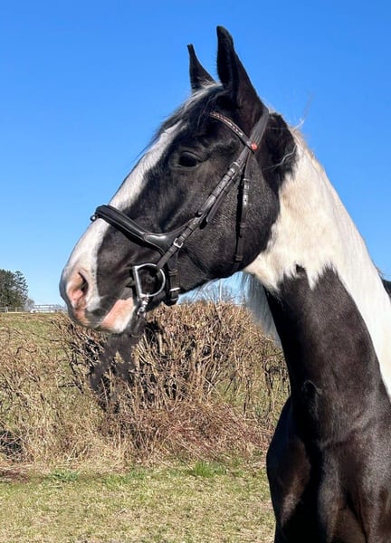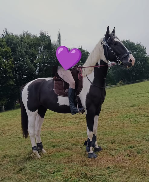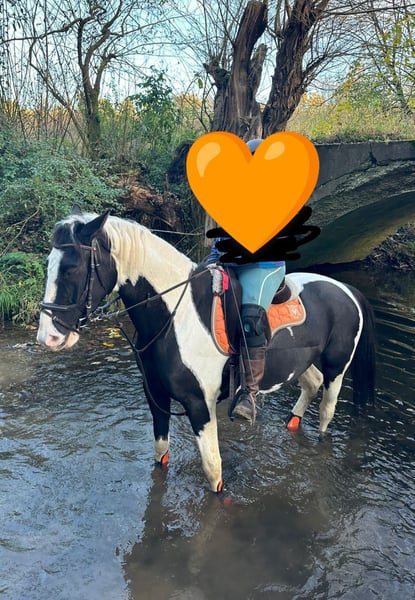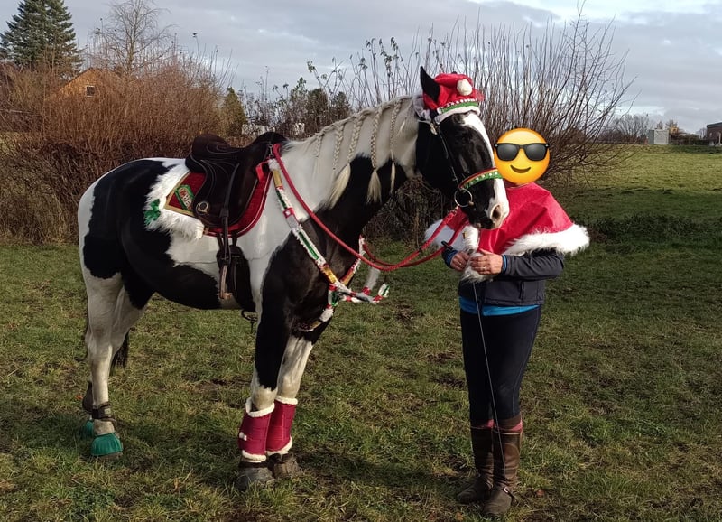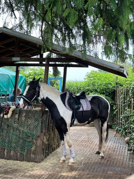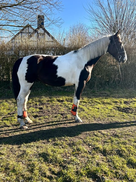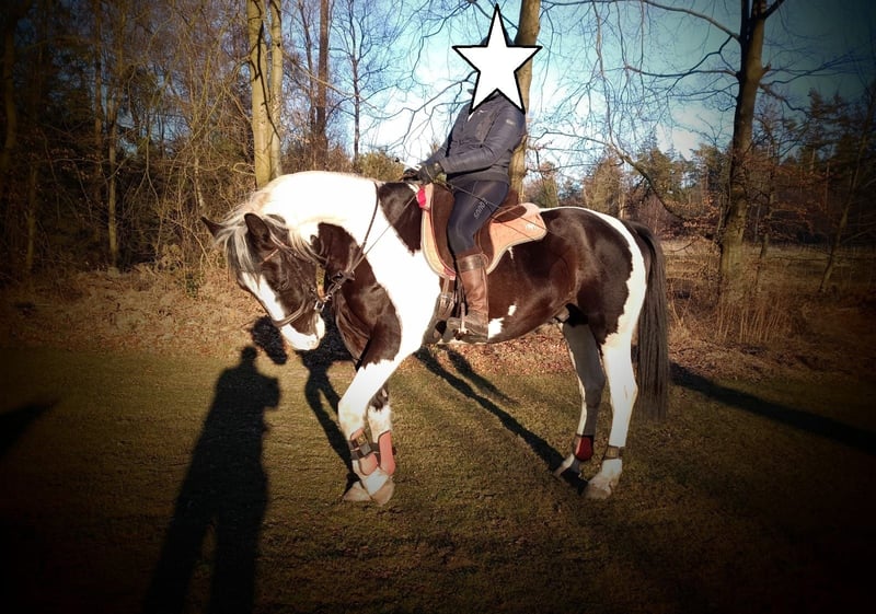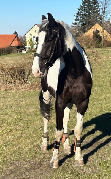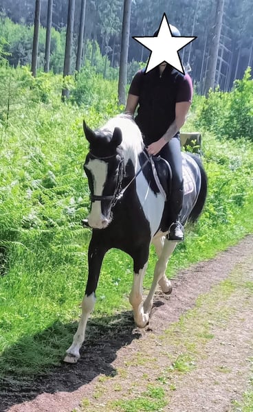 Dyngus (Pablo) - ein 2019 geborener polnischer Sportpferdewallach in der auffälligen und sehr schönen Farbe Rappschecke. Mit einem Stockmaß von etwa 1,70m sowie großrahmigen, harmonischen Gebäude deckt er auch große Reiter gut ab. Er verfügt über eine vollständige Abstammung, ist gesund, PSSM1 n/n getestet und seine kleine Ankaufsuntersuchung vom Juni 2024 war ohne Befund. Aktuell ist er vierfach beschlagen, kann jedoch problemlos auch barhuf gehalten werden. Im täglichen Umgang zeigt sich Dyngus als außergewöhnlich lieber, freundlicher und menschenbezogener Wallach. Er ist ausgeglichen, neugierig, verschmust und lernt sehr schnell. Er verzeiht Reitfehler, lässt sich fein reiten und wird derzeit auch von einer Jugendlichen problemlos geritten. Dyngus ist zudem absolut unkompliziert: Er ist schmiede- und verladefromm sowie brav beim Tierarzt und Hufschmied. In der Herde ist er rangmittig und verträglich mit sowohl Stuten als auch Wallachen. Er lebt im Offenstall bzw. Laufstall und eine artgerechte Haltung mit viel Auslauf und Sozialkontakt wird für ihn weiterhin gewünscht. Unter dem Sattel besitzt er eine solide Grundausbildung. Er geht sicher in allen drei Grundgangarten sowie an der Hand und im Schritt Schenkenweichen / Seitengängen Vorder-/Hinterhandwendung, Rückwärtsrichten etc .Dyngus wird weiterhin gefördert, kennt einige Trail und Working Eqiutation Hindernisse(Brücke, Glockengasse,Tor, Stangenlabyrinth etc) .Er wird Englisch geritten, kennt aber auch den Westernsattel. Er verfügt über viel Geländeerfahrung ( auch in schwierigen + bergigem Gelände). Auch allein ist er souverän unterwegs. Zusätzlich hat er eine zweispännige Fahrausbildung erhalten. Es stellte sich heraus das Kutschefahren nicht seins ist und ihm Stress verursacht. Dies ist auch der EINZIGE Verkaufsgrund, da für die Besitzer aufgrund der eigenen Gesundheit Kutschefahren dem Reiten vorgeht. Ansonsten ist er ein vielseitig einsetzbares, talentiertes Pferd, das bereits an verschiedenen Kursen wie Dressur, Trail oder Working Equitation teilgenommen hat und mit Freude ins Wasser geht. Dyngus ist ein rundum tolles Pferd mit bestem Charakter, schöner Optik und gutem Ausbildungsstand - ein echter Herzenspartner für Menschen, die ein zuverlässiges, lernfreudiges und unkompliziertes Pferd suchen.