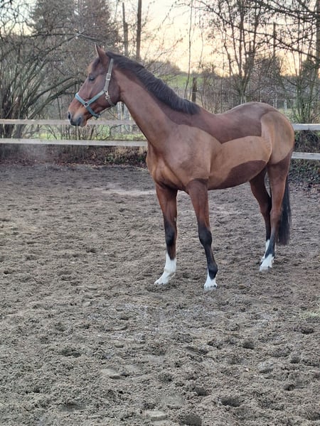 Nach langer Überlegung muss ich mich aufgrund privater und beruflicher Veränderung leider von meinem 9-jährigen Wallach (geb. Mai 2017) trennen. Bumblebee hat ein Stockmaß von 1,75 m und ist ein polnisches Warmblut. Er ist regelmäßig geimpft (halbjährlich Influenza & Herpes, Tetanus), bekommt einmal im Jahr Besuch vom Zahnarzt und halbjährlich Physio. Er hat aktuell keine Eisen und kommt damit auch im Gelände sehr gut klar. Er steht in Boxenhaltung und kommt ganzjährig in einer Wallachherde auf die Koppel. Er ist sowohl mit Wallachen als mit Stuten absolut verträglich. Bumblebee ist in den letzten 3 Jahren bei mir vielseitig beschäftigt worden. Er kennt Ausritte alleine und in der Gruppe und hat sich insbesondere in der Gruppe als sehr brav hervor getan. Wenn er alleine im Gelände unterwegs ist, braucht er meistens noch etwas Sicherheit durch seinen Reiter. Er kennt längere Hängerfahrten, Auswärtstraining, Turniere (mit und ohne Übernachtung) und hat sich hier im Umgang als stets unkompliziert herausgestellt. Er ist am Turnier A* gelaufen und im Training A**, wurde allerdings aufgrund von Zeitmangel meinerseits seit Mitte 2025 nicht mehr gesprungen. Potential für mehr wäre vorhanden, allerdings benötigt Bumblebee beim Springen viel Zeit und eine gute Basis, um die nötige Sicherheit im Parcours zu entwickeln. Da er grundsätzlich deutlich mehr Spaß an vielseitiger Beschäftigung hat und auch zusätzlich regelmäßig dressurmäßig gearbeitet und gymnastiziert sowie im Gelände bewegt wurde, würde ich mir für ihn ein Zuhause wünschen, in dem er ein Leben als ambitionierteres Freizeitpferd genießen kann. Bumblebee ist beim Reiten hin und wieder etwas umweltorientiert, bleibt aber stets händelbar und weist keine Unarten wie Steigen oder Buckeln auf. Aufgrund seiner Größe, seines Alters und Temperaments ist er jedoch nicht für Anfänger/Wiedereinsteiger geeignet. Eine klinische AKU aus 2022 inkl. Röntgenbildern liegt vor. Er war bei mir bisher immer gesund und hat keine bekannten Vorerkrankungen. Eine aktuelle AKU kann gerne auf Kosten des Köufers gemacht werden. Passendes Equipment (Sattel, Trense, Zubehör) ist vorhanden und kann gegen Aufpreis übernommen werden.