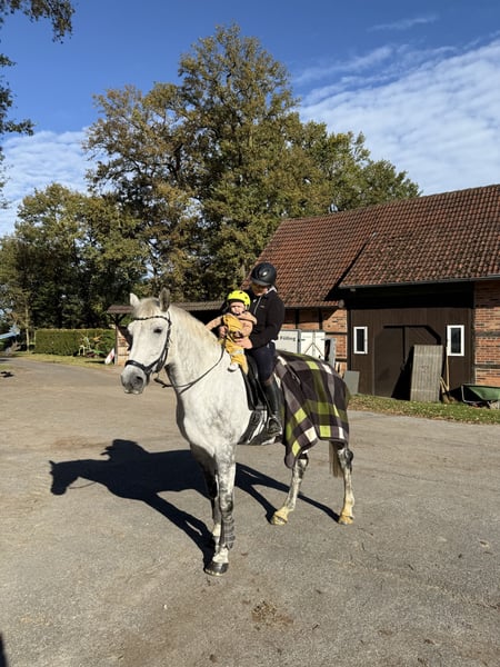 .Manchmal muss man sich schweren Herzens eingestehen, dass sich Familie und Hobby nicht immer unter einen Hut bringen lassen. So ist nun der Moment gekommen, an dem ich für meinen treuen Begleiter Fury ein neues Zuhause suche – eines, in dem er genauso geliebt und geschätzt wird, wie er es verdient. Fury ist ein Pferd, wie man es nur selten findet: immer ehrlich, verlässlich und mit einem riesengroßen Herz. Er ist in jeder Lebenslage ein wahrer Freund – ob beim Ausritt, auf der Weide, in der Dressurarbeit oder über kleinen Sprüngen. Auf ihn kann man sich einfach verlassen. Er ist der Typ Pferd, der jedem Reiter das Gefühl gibt, sicher und getragen zu sein. Für Kinder und Einsteiger ist er ein liebevoller Lehrmeister mit unendlicher Geduld, für erfahrenere Reiter ein Partner, mit dem man sich weiterentwickeln und gemeinsam wachsen kann. Fury möchte immer gefallen und schenkt seinem Menschen alles Vertrauen dieser Welt. Vom Reiterwettbewerb über L-Dressur bis hin zum Jump & Run – Fury ist mit Begeisterung dabei und sorgt dafür, dass alle ihren Spaß haben. Kinderwagen, Trecker, LKW, Mülltonnen, rennende Kinder oder Hunde – all das bringt ihn nicht aus der Ruhe. Auch auf Turnieren bleibt er ganz der Alte: cool, ausgeglichen und motiviert. Aktuell lernt er fleißig fliegende Wechsel (die schon sehr gut gelingen!) und zeigt spielerisch Talent für Piaffe und Passage. In der Vergangenheit wurde er bis L-Dressur vorgestellt und mehrfach in A-Dressuren platziert. Auch beim Springen Macht Fury eine gute Figur, allerdings wurde das nicht weiter gefördert. Er war auf Springturnier, jedoch ohne Erfolg, da leider auch noch ein Pilot mit dabei war, der vieles vermasselt hat. Feste Sprünge sind auch kein Problem. Fury wurde auch gefahren, dieses Jahr ist er einmal eine kleine Runde vor der Kutsche gelaufen, davor mindestens 6 Jahre nicht. Auch da war er ganz brav. Skikjöring ist auch kein Problem. In diesem Frühjahr wurde bei Fury Spat im rechten Sprunggelenk diagnostiziert, zudem wurde dort nach einer Fraktur das Griffelbein entfernt. Er ist nach der Behandlung lahmfrei und voll belastbar, kann regulär gearbeitet werden und genießt seine Aufgaben sichtlich. Fury ist kein „Verkaufsobjekt“, sondern ein echtes Herzenspferd. Ich wünsche mir für ihn ein Zuhause, in dem er Teil der Familie ist – mit Menschen, die seine ruhige, treue Art genauso zu schätzen wissen wie ich.