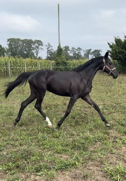 Fantazja-T, geboren am 22.04.2024 Rasse: Wielkopolska Mutter: F-ŁEZKA Vater: PARAMETR Elegante Stute mit sehr femininem Typ und ausgezeichneten sportlichen Voraussetzungen. Gesunde, energiegeladene Stute, problemlos bei allen Pflegearbeiten, beim Schmied sowie an der Waschbox. Freundlich gegenüber Menschen und anderen Pferden im Herdenverband. Bereits an der Longe ausgebildet, beidseitig gearbeitet.