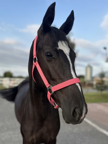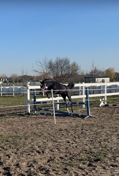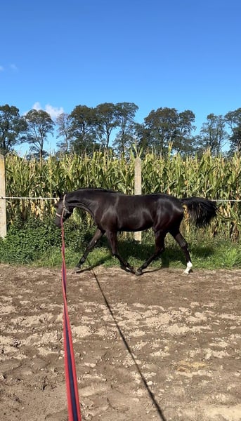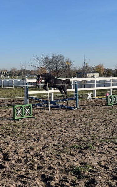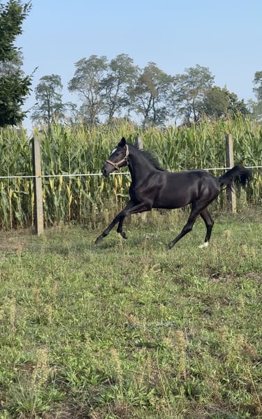 Fantazja-T, born on April 22, 2024 Breed: Greater Poland Mother: F-ŁEZKA Father: PARAMETR This mare has an elegant appearance with a very feminine type and excellent sporting predispositions. She is healthy, energetic, and easy to handle during all grooming procedures, farrier visits, and washing. Friendly towards humans as well as other horses in the herd. Trained to work on the lunge line in both directions.