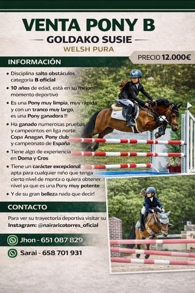 Disciplina salto obstáculos, categoría B oficial, 10 años de edad, está en su mejor momento deportivo, es una poni muy limpia, muy rápida y con tranco muy largo, es una poni ganadora, ha ganado numerosas pruebas y campeonatos en liga norte, copa Anagan, poni club de España, campeonato España de ponis, y ganadora de numerosos concursos locales, tiene algo de experiencia en doma clásica y cross Tiene un carácter excepcional apta para cualquier niño que tenga cierto nivel de monta o quiera obtenerlo ya que es una poni muy potente