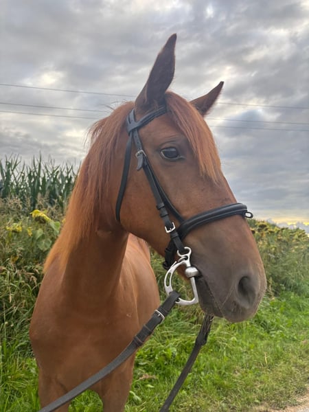 This mare is very well-behaved and not spooky. She knows 4GGA and can also go out for rides alone. She is being prepared for dressage and jumping. She is still at the beginning of her training but very talented. She is familiar with the farrier and loads into any trailer like a princess. A vet check can be done if desired.
