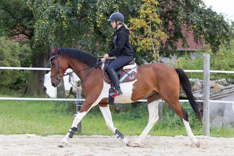 Winnie the Pooh Świetny wałach w brązowo-białej kurtce 7-letni Stan szkolenia A/L Wzrost 167 Rentgeny ✅ Oberweitersdorf w pobliżu Linzu Ma wielkie serce do crossu i towarzyszy młodszym jeźdźcom w trudnych chwilach. Absolutnie spokojny, bez złych nawyków, również podczas jazd w terenie Winnie chętnie uczestniczy, aby po prostu się zrelaksować.
