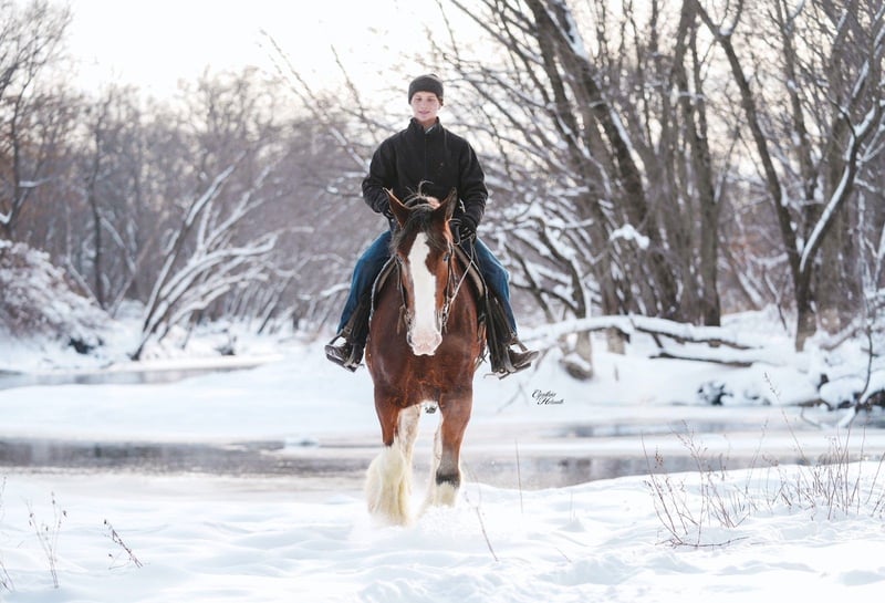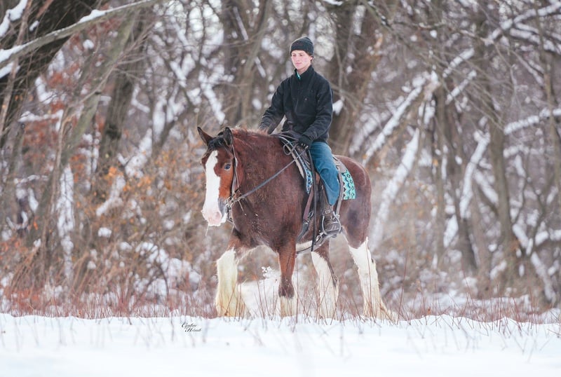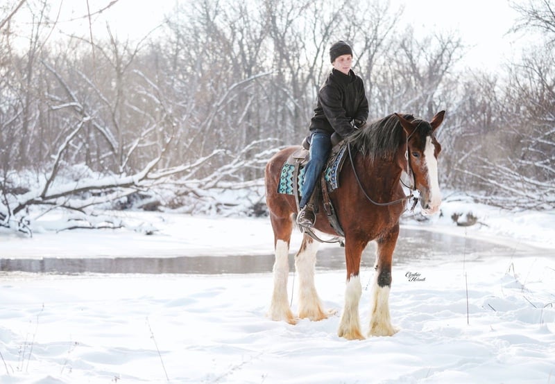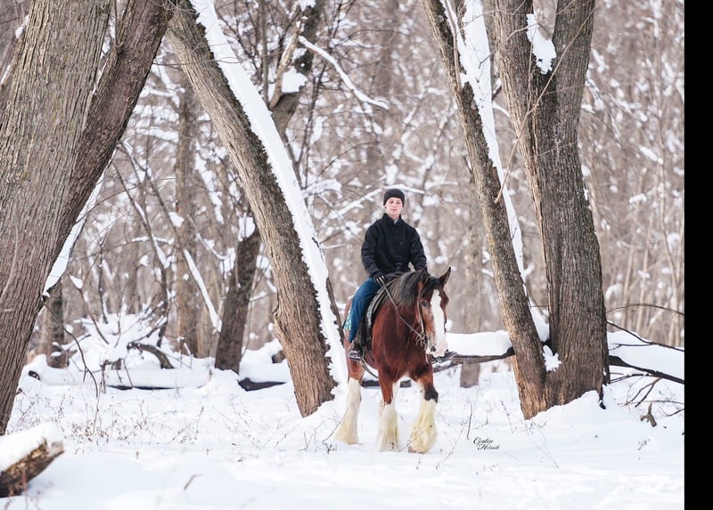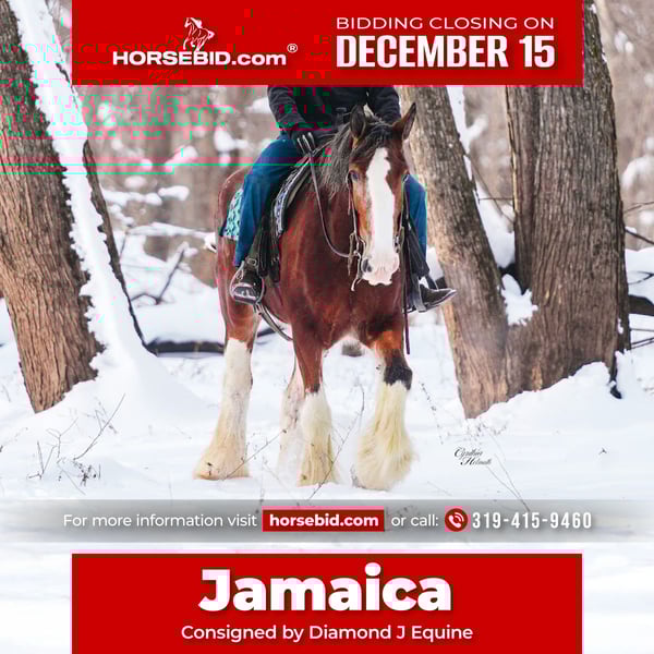 🎄𝐓𝐇𝐄 𝑯𝒐𝒍𝒊𝒅𝒂𝒚 𝐂𝐋𝐀𝐒𝐒𝐈𝐂🎄 Happening now thru MONDAY | DECEMBER 15th - Available EXCLUSIVELY on HorseBid's website! For more details and to register visit: www.Horsebid.com CONSIGNOR CONTACT: Diamond J Equine 319-415-9460 LOCATION: Fairbank, IA BREED: Clydesdale REGISTERED: Yes REGISTERED NAME: Chateau Gai Jamaica COLOR: Bay HEIGHT: 17.3 AGE: 11 GENDER: Mare Jamaica is an 11-year-old, 17.3 hand Registered Clydesdale mare. She is broke to both ride and drive, single and double. Jamaica was broke as a 3 year old and then primarily used as a brood mare until this fall when she weaned her foal. She is gaining her weight back nicely after weaning her foal this fall, and is just a pleasant mare to have in the barn. We have enjoyed riding her out on trails, and she is a blast to drive and go sledding with in the snow! Jamaica is good for the farrier, loads in a trailer, and is sound. Please call us at 319-415-9460 for more info on Jamaica. Thank you!