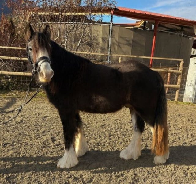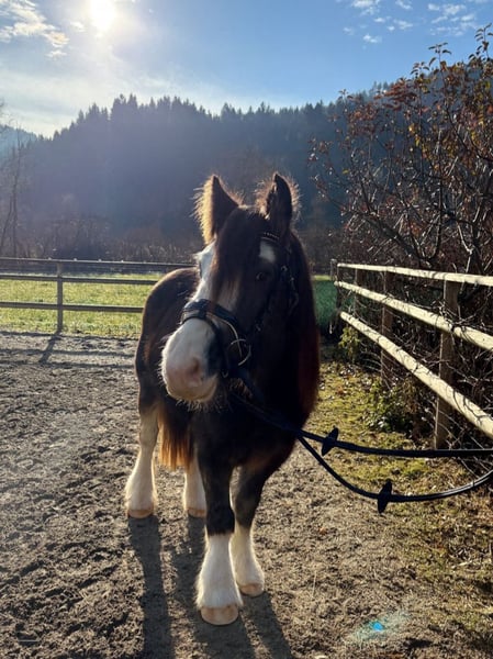 ✨ Irish Cob Gelding – Stunning Youngster in Unique Color Seeks New Home ✨ Breed: Irish Cob Gender: Gelding Date of Birth: May 6, 2023 Height: Currently approximately 14.2 hh – still growing, expected final height around 14.4–14.6 hh Color: Rare splash-colored brown with a beautiful blaze and four white legs – a real eye-catcher Pedigree: Fully documented Description This charming Irish Cob gelding in a rare splash-colored brown coat is not only a visual highlight but also impresses with his exceptionally sweet, calm, and human-oriented nature. He was raised appropriately in a herd environment, well-socialized, and very compatible with other horses. Training Level Despite his young age, he has been gently and age-appropriately trained. He already knows: - Saddle and bridle - Groundwork - Lunging in all three basic gaits - Rider’s weight - Walks outside the farm During walks, he is completely fearless and confident. He is familiar with trains, tractors, dogs, cats, cows, cyclists, and much more – all of which do not disturb his composure. In daily handling, he remains well-behaved, reliable, and patient. He is always calm when groomed or when around children. He willingly gives all four hooves, has been regularly introduced to the farrier, and is barefoot without issues. Character - Very affectionate and human-oriented - Calm, composed, and stress-resistant - Well-socialized & herd-safe - Ideal for families, children, and therapeutic riding Health - Regularly dewormed - Vaccinated (Influenza & Tetanus) - Healthy, without vices or abnormalities Additional Information For now, he can continue to enjoy his time in the herd. If no new home is found soon, he will be gently backed in spring, further expanding his riding possibilities. A viewing is possible at any time by prior arrangement, and transportation can be organized upon request. Has he caught your interest? I am happy to send videos or answer any further questions.