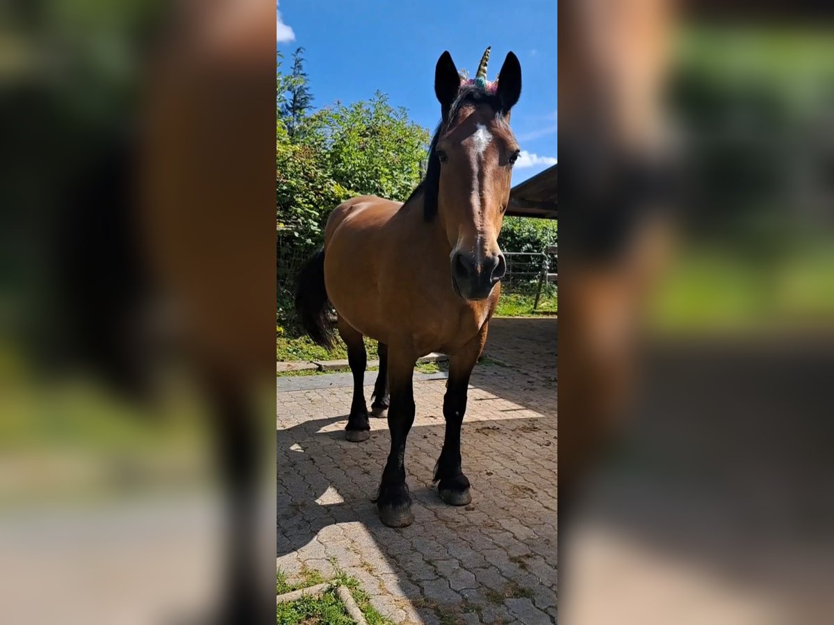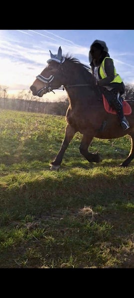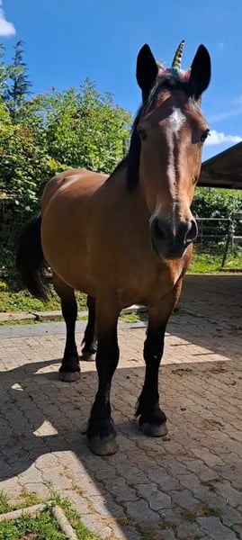For sale: Stylish Dark Brown French Cob (Cob Normand) – Perfect for leisure riding! We are offering a beautiful Cob mare, born in 2009. With an impressive height of 15.3 hh, she is an elegant companion for all leisure activities. Indoors, she is very well-behaved and calm; in the field, the Thoroughbred influence shows a bit more, making her more spirited (but always manageable). She is said to have been driven, but I cannot confirm this with certainty. We once lunged her, and she performed well. She impresses with her friendly nature and versatility, making her ideal for long rides, as well as a school horse in the arena or on the cross-country course. The mare is healthy, well-trained, and accustomed to human interaction. She is reliable, balanced, and suitable for both experienced riders and ambitious beginners seeking a dependable partner. Currently, she is kept in an open stall and previously was on a large pasture in a herd, so I am unsure if she is suitable for box stall housing. Additionally, she does not like being left alone at all. If interested or for more information, please feel free to contact me. Viewing and trial riding are possible by arrangement.