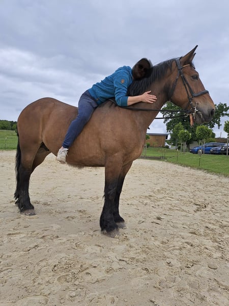 Te koop: stijlvolle donkerbruine Franse cob (Normandische cob) – perfect voor de recreatie! Het gaat om een prachtige cob-merrie, geboren in 2009. Met haar indrukwekkende stokmaat van 1,60 m is ze een elegante metgezel voor alle vrijetijdsactiviteiten. In de bak gaat ze zeer braaf en rustig, in het buitenrijden komt haar vollebloedinvloed iets naar voren en is ze wat sprankelender (maar altijd goed handelbaar). Ze zou ook bereden zijn, maar dat kan ik niet met zekerheid zeggen. We hebben haar eens aan de longe laten lopen en dat deed ze goed. Ze overtuigt door haar vriendelijke aard en haar veelzijdigheid, ideaal voor lange buitenritten en als lespaard in de bak of op het terrein. De merrie is gezond, goed opgeleid en kent omgang met mensen. Ze is betrouwbaar, evenwichtig en geschikt voor zowel ervaren ruiters als ambitieuze beginners die op zoek zijn naar een betrouwbare partner. Ze staat momenteel in een openstal en daarvoor stond ze ook op een grote wei in een kudde, daarom weet ik niet of ze geschikt is voor boxenstallen. Bovendien houdt ze er niet van om alleen gelaten te worden. Bij interesse of voor meer informatie ben ik graag bereid om te helpen. Bezichtiging en proefritten mogelijk op afspraak.