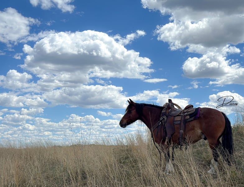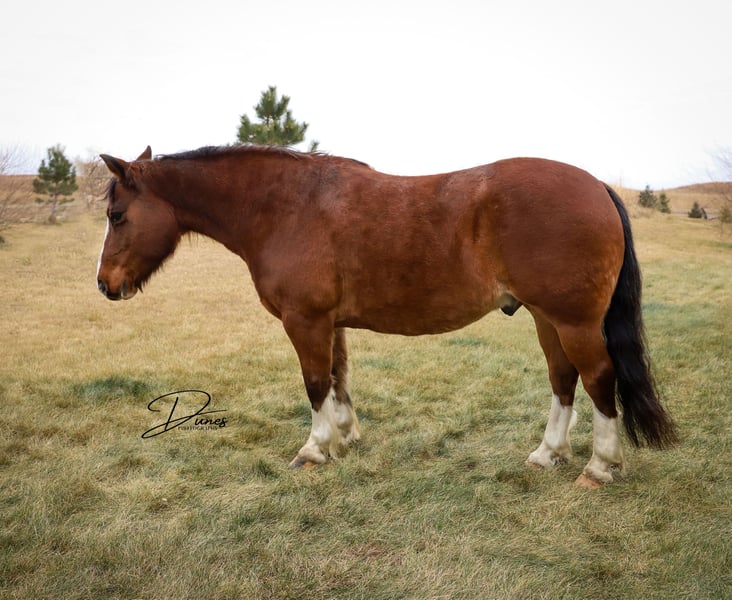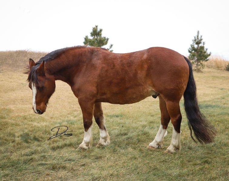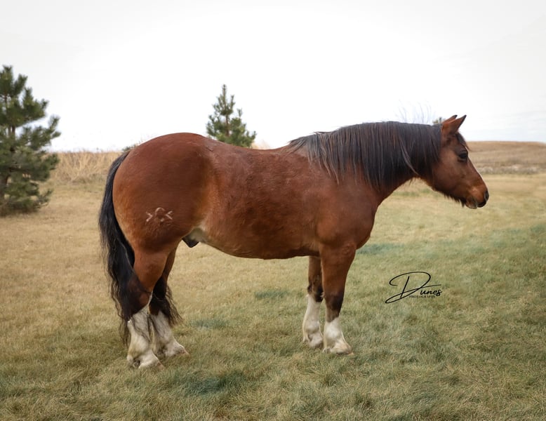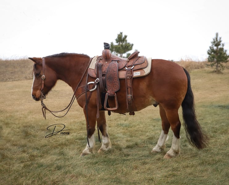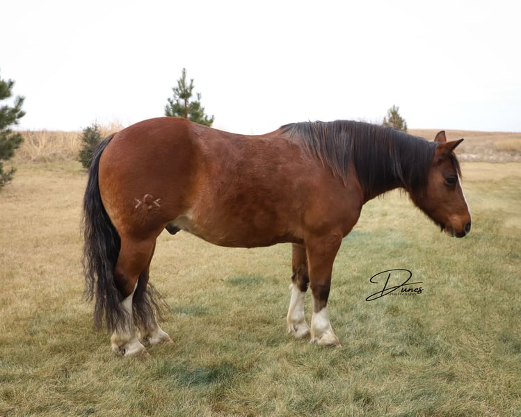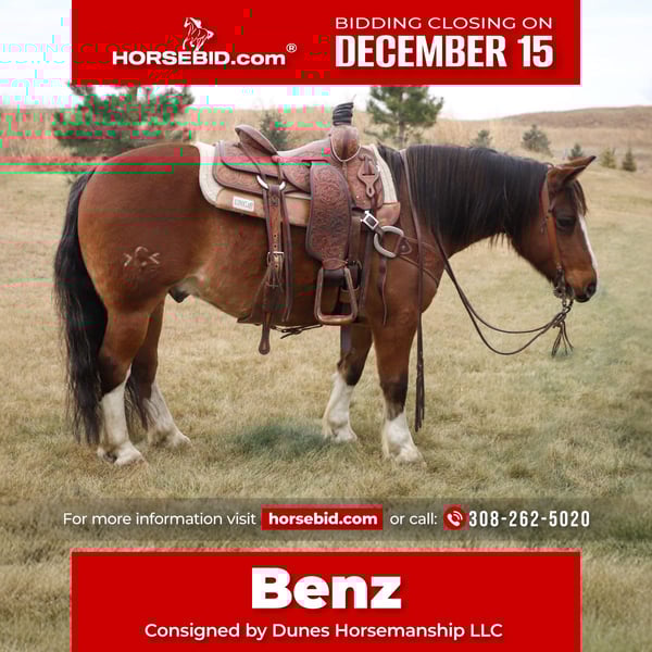 🎄𝐓𝐇𝐄 𝑯𝒐𝒍𝒊𝒅𝒂𝒚 𝐂𝐋𝐀𝐒𝐒𝐈𝐂🎄 Happening now thru MONDAY | DECEMBER 15th - Available EXCLUSIVELY on HorseBid's website! For more details and to register visit: www.Horsebid.com CONSIGNOR CONTACT: Dunes Horsemanship LLC 308-262-5020 LOCATION: Thedford, NE BREED: Quarter/Gypsy Cross REGISTERED: No COLOR: Bay roan HEIGHT: 13.3 AGE: 10 GENDER: Gelding Although it’s hard to see because he currently has more hair than a grizzly bear, he is dripping with chrome. From his knee high stockings to his robicano roaning, he definitely isn’t lacking in the flashy department! It’s hard to put into words how much we love this double scoop of a gelding. Benz has been a part of our family for several years now and we have loved every minute of it. Benz is a 10 year old quarter/draft cross. He has big, stout, feathered feet, enough mane and tail to make the big horses jealous, and bone and substance for days. He stands just shy of 14 hands tall and is equally as wide. Benz has plenty enough size for kids and adults alike to enjoy. Had we not lost our main pickup to lightning this summer, he would NEVER be leaving us! But, unfortunately, buying a new vehicle these days is similar to buying a new house, and that is rough on a bank account! Benz has done every aspect of ranch life and has quite the resume. We have drug calves in the spring for brandings, covered big hills gathering cows as the sun rises, and has enjoyed many a trail ride through town and across the pastures. If you are after a horse who will ride the same whether you crawl on in January or in June, Benz is your guy. He will ride in a group, or leave the barn completely alone, eager to see the sights and enjoy the day. He is guaranteed to get you home safely! Benz knows his leads, has a very nice stop, neck reins, and is very user friendly. We feel he is a safe, reliable option for anyone who has a little time in the saddle under their belts. We have toted our toddler around on him and he has always taken care of us! We even lent him to a local boy to show for 4H after his gelding was injured and they did wonderfully together. He is the guy that just wants to eat and get along in the herd so he is never one to stir up trouble. He is sound barefoot and stands quietly for me to trim him with the lead on the ground. He is the kind that doesn’t come around often so don’t let him slip by! As with all of our horses, if you ever need a quick refresher after a long winter, or just want a little tune up, bring him back to us and we will dust off the cobwebs for you, for free. We want nothing more than to ensure the success of our horses in their new home! Please feel free to call/text/email with any questions you may have or to plan a trip to take him for a test drive! Tess Chytka Dunes Horsemanship 308-262-5020