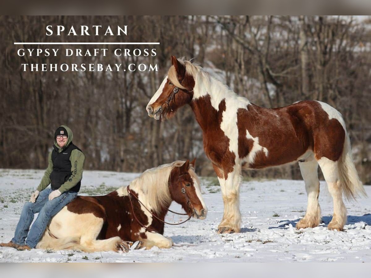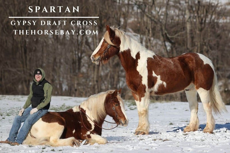 OPEN BIDDING ON THEHORSEBAY,COM. SALE ENDS ON 01/29. More information is available on the website, including an UTD vet inspection, Coggins, video, images, and the owner's contact information to ask questions, request information, or make arrangements to come to visit. Spartan is a STOUT built Gypsy Cross Horse gelding that is standing around 16hh and weighing 1300lbs. He has all the good looks, the feathering and (the best part) the mindset that anyone could ask for! He is one cool looking guy to say the least! Not only does he look cool, but he also has all of the other boxes checked as well… he friendly, loves attention and is very calm natured. Spartan has been in a natural horsemanship program since early last year and has completed the training. He knows some tricks as he will bow and lay down on command. Spartan has been ridden by all ages of riders and is very quiet and gentle. He has been ridden and driven down the highways and he is traffic safe. Spartan is great on trails, and he will cross creeks, ditches, logs and navigate rough, rocky areas. He has a smooth jog and a VERY VERY nice easy to set lope! He has been exposed to all kinds of wildlife such as deer or turkey or other animals like cows or dogs and will go anywhere that he is asked too. He has been ridden many miles in the mountains of Eastern Kentucky and encountered every obstacle possible on the trail. He will go up or down even the steepest slopes, across deep creeks, over downed trees, and over all types of rough terrain while still being sure footed. Spartan is not cinchy, cold backed, does not crib or weave. Spartan is a super cool horse that anyone is sure to love!!!