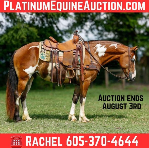 NLINE AUCTION Place your bids at www.PlatinumEquineAuction.com Starting Bid $3500 Auction ends August 3rd, 2025 Need a new saddle? Check out White Rock Saddles on our website or Facebook Benji is a 10 year old gypsy cross gelding, standing 14.3 hands tall and is as flashy as they come! If your looking for a horse that combines beauty, brains, and a gentle temperament? Look no further! This eye-catching gelding boasts the striking color of a Paint with the sturdy build and flowing feathering of a Gypsy Vanner! Benji has been trail rode all over, he goes wherever he is asked, crosses the creeks, logs and bridges great! He has also been around cattle for basic ranch work such as gathering and penning. Benji has also spent a little time in the arena, he is soft in the face, he has a willing attitude and smooth gaits. Whether you’re looking for a trail partner, a dressage prospect, or a stunning addition to your family, this gelding has the potential to excel in any discipline. Don’t miss the opportunity to own this exceptional crossbred gelding! If you would like to schedule a time to come meet and ride Benji , or have any other questions about Benji feel free to reach out! ☎️ Rachel , 605-370-4644. Benji is located in Rusk TX, we can also help arrange shipping nationwide! ONLINE AUCTION Place your bids at www.PlatinumEquineAuction.com Starting Bid $3500 Auction ends August 3rd, 2025 Need a new saddle? Check out White Rock Saddles on our website or Facebook