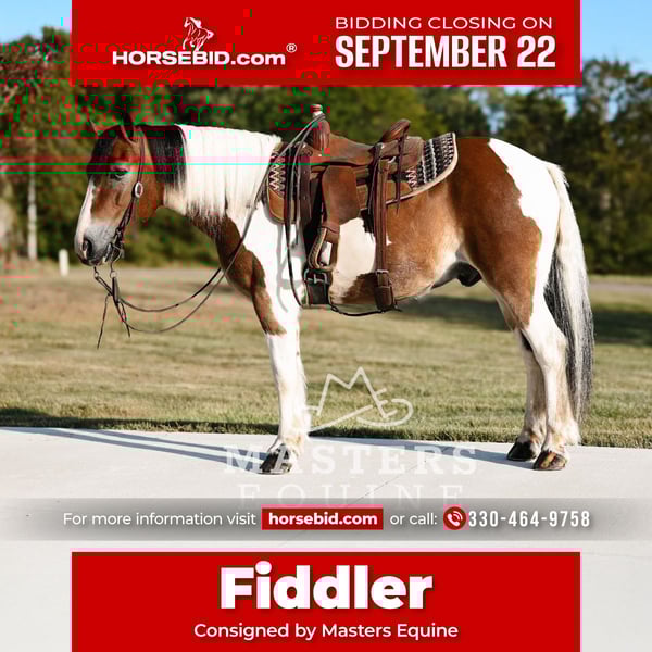 🍁𝒕𝒉𝒆 𝐅𝐀𝐋𝐋 𝑺𝒑𝒆𝒄𝒕𝒂𝒄𝒖𝒍𝒂𝒓🍁 Happening now thru MONDAY | SEPTEMBER 22nd - Available EXCLUSIVELY on HorseBid's website! For more details and to register visit: www.Horsebid.com CONSIGNOR CONTACT: Masters Equine 330-464-9758 LOCATION: Orrville, OH BREED: Gypsy x Haflinger REGISTERED: No COLOR: Paint HEIGHT: 13.1 AGE: 13 GENDER: Gelding If you’ve been searching for a safe, steady, and truly family-friendly partner, Fiddler checks all the boxes. This beautiful Gypsy cross pony has “family-friendly” written all over him. He’s been our daughter’s trusted partner as she learns to ride all on her own, and he’s taken it all in stride with patience and kindness. The kids have ridden him all over the farm, and he takes every obstacle in stride. He’s been ridden past livestock, farm equipment, and busy traffic without a fuss. If you’ve always dreamed of hitching up a pony but don’t have much driving experience, don’t worry, Fiddler knows his job inside and out. He makes it easy for anyone to hitch him up and enjoy a safe, relaxed drive down the road, even with heavy traffic and semis rolling by. Fiddler is the definition of “more whoa than go.” He’s perfectly content to plod along while the kids ride him over the same obstacles for an hour. Safe, steady, and patient—he gives new riders the confidence they need. With his stocky build, good foot and bone, and great disposition, he’s the perfect step-up pony for older kids, and even big enough to carry adults. Fiddler is the kind that enjoys being with you. He knows some basics of liberty work and will happily follow you around like a big puppy dog. Whether it’s on the trails, hitched to a cart, or just hanging out in the yard, he’s the type of partner you can count on to be quiet, broke, and dependable, even with time off. At 13 years old, Fiddler has been around the block enough to know his job well, but he’s still young enough to give your family many years of safe and memorable rides. For young families, grandparents, or anyone looking for a trustworthy, family-friendly pony, Fiddler is your guy!