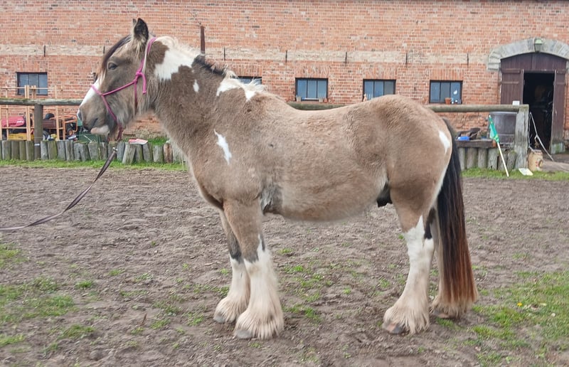 Hier kommt dein Traumpferd! Ein Irish Cob Wallach in einer absolut tollen Farbe - Buckskin Tobiano- mit einer langen wallenden Mähne! Pepe ist ein Chameur durch und durch. Er liebt es bekuschelt und betüddelt zu werden. Er lässt sich geduldig stundenlang seine Mähne und Fell bürsten. Gibt brav die Hufe und lässt sich super vom Boden arbeiten. Pepe wurde bereits longiert mit Sattel und kennt das Reitergewicht. Hierbei ist er sehr brav. Er steht in Robusthaltung in einer gemischten Herde und läuft Barhuf. Geb 5/22 EM ca 145Cm Papier vom ICS nl