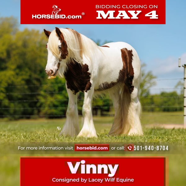 ▪️▫️◾️𝐭𝐡𝐞 𝑴𝒂𝒚 𝐒𝐞𝐥𝐞𝐜𝐭◾️▫️▪️ Happening now thru MONDAY | MAY 4th - Available EXCLUSIVELY on HorseBid's website! For more details and to register visit: www.Horsebid.com CONSIGNOR CONTACT: Lacey Wilf Equine 501-940-8704 LOCATION: Quitman, AR BREED: Gypsy Vanner REGISTERED: Yes REGISTERED NAME: TMR AVENTUS COLOR: Chestnut Tobiano HEIGHT: 14 AGE: 3 GENDER: Gelding Let me introduce you to my best friend, TMR Aventus, better known as Vinny. This handsome, majestic, and endlessly personable 3-year-old gelding stands 14 hands and has the kind of presence you notice immediately, but it is his heart that makes him unforgettable. Vinny absolutely loves everyone. He is the horse that wants to be part of whatever you are doing, whether that means meeting you at the gate, resting his head near you, or spending the afternoon napping and cuddling with his human friends. He has a way of making every ordinary barn day feel a little more special. Under saddle, Vinny is every bit as enjoyable as he is on the ground. He is a beautiful mover with natural balance, catches both leads, has a big stop, and carries himself with a willing, trainable attitude. He is athletic, versatile, and kind-minded, with the ability to go in so many different directions. Down the trail, Vinny is steady, pleasant, and happy to go where he is pointed. He has also spent days working at the stockyards around cattle and does not mind a day’s work, giving him the kind of real-world experience that only adds to his confidence. On the ground, Vinny sets a standard for manners, quiet, respectful, and consistent in everything from catching to the farrier. Horses like him are hard to find, the kind that feel like more than just a horse. With Vinny, you are not just gaining a talented young gelding, you are gaining a genuine partner, the kind that becomes part of your family the second he steps off the trailer.