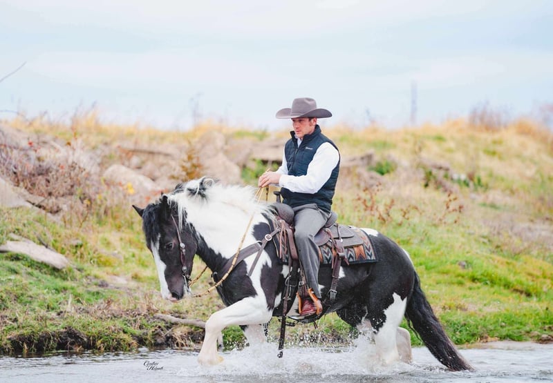 ⚜️ 𝓗𝓮𝓻𝓲𝓽𝓪𝓰𝓮 𝐖𝐢𝐧𝐭𝐞𝐫 𝓒𝓵𝓪𝓼𝓼𝓲𝓬⚜️ Happening now thru MONDAY | DECEMBER 29th - Available EXCLUSIVELY on HorseBid's website! For more details and to register visit: www.Horsebid.com CONSIGNOR CONTACT: R & R Regal Equine 319-334-8649 LOCATION: Independence IA BREED: Gypsy Vanner Haflinger Cross REGISTERED: No COLOR: Black and White Tobiano HEIGHT: 15 AGE: 4 GENDER: Gelding Bentley is a 2022 model , 15 hand Gypsy Vanner / Haflinger cross gelding with a kind, steady disposition and a willing attitude. He is trained to ride and drive and goes comfortably English and Western, making him a versatile option for a family looking for one horse that can do it all. Bentley is reliable on the trail, handling new environments calmly and confidently. He does well crossing water and takes unfamiliar situations in stride, showing a sensible, level-headed nature that families appreciate. Under saddle, he is easy to ride, responsive, and enjoys his work without being pushy. With his sturdy build, gentle temperament, and solid training foundation, Bentley is well suited for family riding, pleasure use, trail adventures, or light driving. He is a great choice for those wanting a young gelding with a good mind, versatility, and the potential to grow into a dependable long-term partner. He can be registered with GHRA