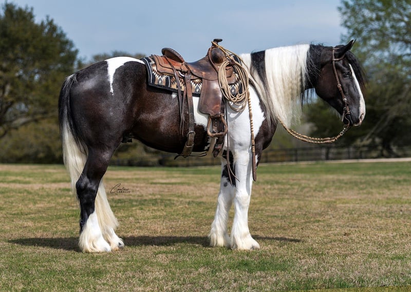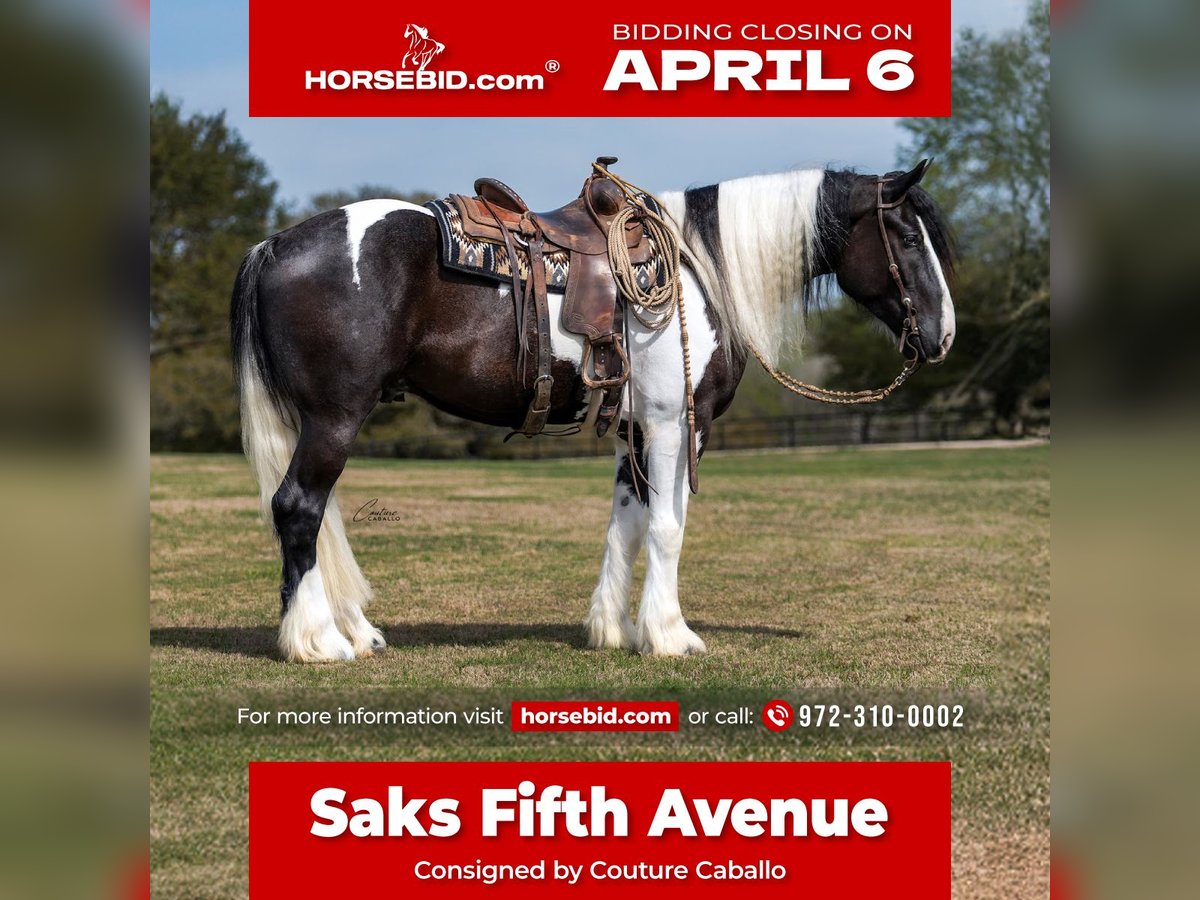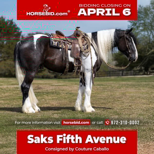 🌟𝑨𝒑𝒓𝒊𝒍 𝐀𝐋𝐋 𝐒𝐓𝐀𝐑 𝐋𝐈𝐍𝐄𝐔𝐏🌟 Happening now thru MONDAY | APRIL 6th - Available EXCLUSIVELY on HorseBid's website! For more details and to register visit: www.Horsebid.com CONSIGNOR CONTACT: Couture Caballo 972-310-0002 LOCATION: Fort Worth, TX BREED: Gypsy Vanner Cross REGISTERED: No REGISTERED NAME: Saks Fifth Avenue COLOR: Black & White HEIGHT: 16 AGE: 5 GENDER: Gelding In a league of his own, Saks Fifth Avenue is a top shelf gelding that packs precision, strength, and style into one feather footed package. Standing at 16 hands, this 2021 gypsy cross gelding is unlike any horse — let alone any draft cross I’ve come across. Through the process of consigning this horse, it's been difficult to articulate how deeply special this gentleman is, but my hope is his presence will be well represented through his pictures and video... They don’t make many like this. The initial feeling Saks gives when you walk into the barn to meet him is valiance. He has a calm, kind, knowing nature about him, and the deep look in his eye says so much without mustering a whisper. From his sturdy foot and bone to his shoulder length mane and billowing tail; structurally, you are looking at an individual dripping in both style & substance. What stands out about his appearance is not only his size and chrome, but his narrow shoulders and balanced hip, show very evidently that this is not your average draft horse, but an animal built to do it all. Saks travels exceptionally well with an unrestricted floaty movement, a careful, steady cadence, and a reiner style handle. He is liberated and soft through his neck and body- easily able to side pass up to a gate, or lope off from a walk. This horse also has a sliding stop, a nice spin, and a comfortable slow jog or ground traveling extended trot. He’s been ridden both English and western, on contact or on a draped rein, and is the type of horse that would thrive in versatility, western dressage, or as a very high end pickup or grand entry horse. Saks is the one you take to town. He rides just as consistent outside, as he does in the arena— and the more time you spend with him, the more this gelding shows you how eager he is to do the right thing and be your trusted partner. Saks is kind and delicate with the little ones— but I would consider him a performance type horse that would thrive as a tool for a job or a task with purpose. He is not hot or overly feely, but he is not an old burnt out plug. He has athleticism, try, and most of all HEART! This horse has been hauled extensively, been used as a turn back horse in the cutting pen, a weekend trail warrior, and is no stranger to traffic, cattle, or chaos! He stands tied, is easy to shoe (even with his massive feet), gets along well alone or with others, and does not miss a meal! He is SOUND, clean legged, easy to catch (he catches you half the time), stands for mounting (even when 5’3 blondes attempt to climb aboard from the ground), and has truly been such a fun one to have around. Feel free to come see him in person, or reach out with any and all questions at 972-310-0002