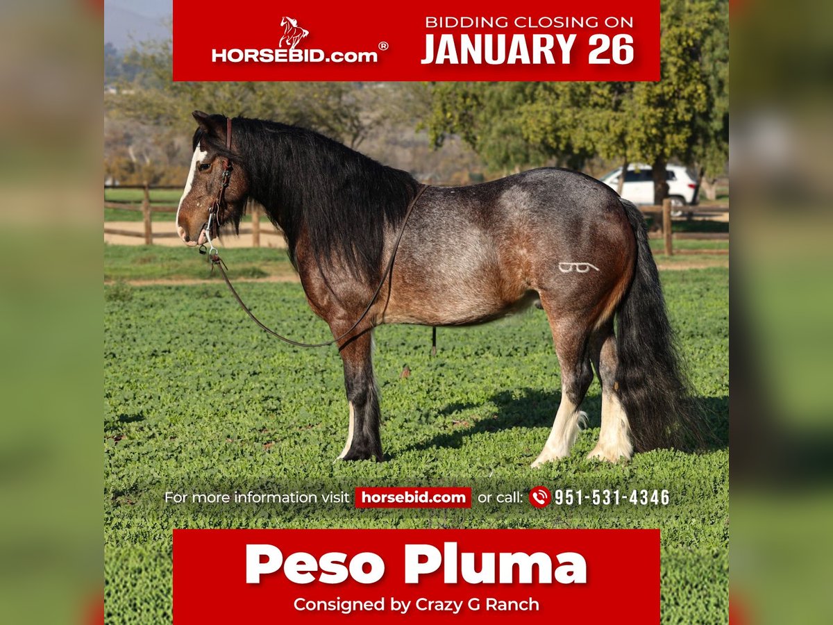 𝐉𝐀𝐍𝐔𝐀𝐑𝐘 ⭐️𝑨𝒍𝒍 𝑺𝒕𝒂𝒓 𝑳𝒊𝒏𝒆𝒖𝒑⭐️ Happening now thru MONDAY | JANUARY 26th - Available EXCLUSIVELY on HorseBid's website! For more details and to register visit: www.Horsebid.com CONSIGNOR CONTACT: Crazy G Ranch 951-531-4346 LOCATION: Norco, CA BREED: Gypsy Vanner / quarter pony cross REGISTERED: No REGISTERED NAME: Peso Pluma COLOR: Bay roan HEIGHT: 13.1 AGE: 6 GENDER: Gelding Outstanding All-Around Pony – Gypsy Vanner x Quarter Pony Gelding Meet Pluma, a handsome Gypsy Vanner x Quarter Pony cross gelding with the looks, brains, and versatility everyone is searching for. Pluma is truly an outstanding all-around pony who has experience in jumping, trail riding, gymkhana events, and obstacle trail courses. Pluma is quiet, willing, and dependable, making him suitable for riders of all levels. He is forgiving and kind, with a great work ethic and an easygoing attitude both in and out of the arena. On the trail, he is confident and steady; in the arena, he’s responsive and fun to ride. With his solid foundation, versatility, and gentle nature, Pluma would make an excellent first pony, while still being enjoyable for more experienced riders looking for a safe, reliable partner. Pluma has done a season of jr rodeo and excelled at it! From heeling, goat tying to running barrels! Pluma is not only a solid riding mount but he also has a few tricks under his sleeve! Pluma is trained to bow, lay down, and sit like a dog! If you’re looking for a pony that can do a little bit of everything and do it well, Pluma is the one. Pluma comes 100% sound and healthy, no colic, or lameness issues!