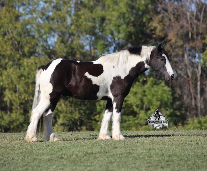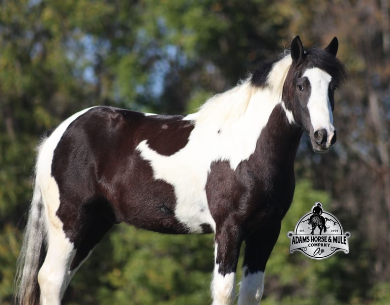 Go to visit our website for more pics and a video www.AdamsHorseAndMuleCo.com AHAMC has been in the horse business and sold horses over the internet since 2005. We have a long track record of success with hundreds of happy customers. We work hard to match riders with the correct horses and specialize in beginner safe, family friendly horses that have been used and checked out by our family! We can set up transportation anywhere in the US and look forward to working with you. Lakota is standing around 14h, he is 5 years old, a Gypsy Vanner Cross, Gelding and if you are looking for a horse that will bring countless smiles, miles of memories and nothing but good times in the saddle… then meet Lakota. He has been our 7-year-old boys favorite ride all summer long, and he has been tested over and over again, passing with flying colors every time! This guy loves attention and likes to be pampered! From braids to baths, he loves his time with his kids! He is gentle enough for the kids to ride but stout enough to comfortably carry a smaller adult. Lakota is a phenomenal trail horse and goes anywhere that he is asked. He has been ridden up/down steep slopes, across creeks, ditches, deadfall, rough rocky areas… you name it, and he can handle it. He rides with confidence, will go out alone, will ride in the front or back of the group and leaves the barn with no issues. He is traffic safe and has been ridden through town. He lopes nice circles, takes the correct leads, has a good stop and is easy to operate. In addition to riding western Lakota has been ridden English and has been over jumps. He has been ridden around the ranch and through the cows. Lakota is a great horse for the whole family to love and enjoy for years to come! For more info call Eric 606-308-2461.