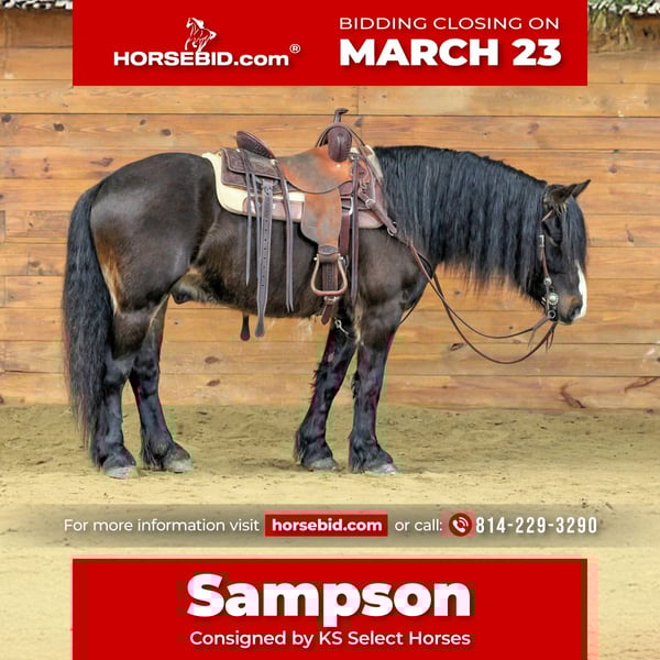 ⚜️𝓽𝓱𝓮 𝐆𝐎𝐋𝐃 𝓢𝓮𝓵𝓮𝓬𝓽⚜️ Happening now thru MONDAY | MARCH 23rd - Available EXCLUSIVELY on HorseBid's website! For more details and to register visit: www.Horsebid.com CONSIGNOR CONTACT: KS Select Horses 814-229-3290 LOCATION: Clarion, PA BREED: Gypsy REGISTERED: No COLOR: Bay HEIGHT: 14.1 AGE: 6 GENDER: Gelding Sampson is a 6 Year Old Gypsy Gelding. Standing 14.1 hands tall and super stocky built. Sampson is very unique! He is super good looking and has the disposition to go with it. Sampson rides the very best and is very quiet and gentle to ride. Suitable for all types of riders. Sampson has a good one hand neck rein, good stop, side pass, and back up. Smooth trot with head set and nice easy to sit canter. Rides English or Western. We have primarily rode him western but he is versatile enough to go in any direction. Sampson is a great trail horse. Trail ride him alone or with other horses. Goes thru the mud , creeks and over the logs with ease. Very seasoned. He is broke and rides like a horse twice his age. Has lots of personality and is the kind of horse that is easy to bond with. Very Well Trained but Also Very Gentle and Good Minded. Let him sit for a few weeks pull him out of the stall saddle him up and will ride of gentle. He will stay good broke and gentle with time off. Sampson can go in any direction and the skys the limit for him. Whoever is the Winning Bidder is getting a forever horse. Sampson just had a Vet Health Exam on 3-13-26 and got a clean bill of health. We can help arrange delivery anywhere in the United States. Feel Free To Call Kris at 814-229-3290. Thank You and God Bless
