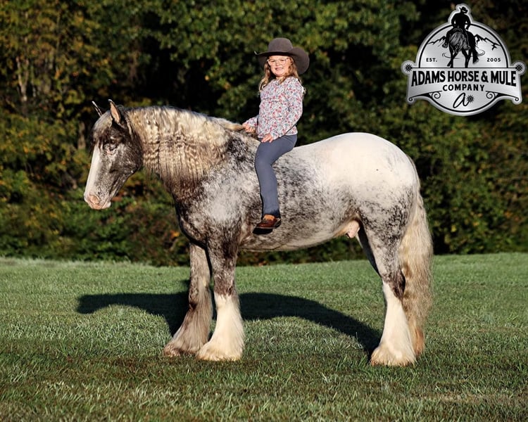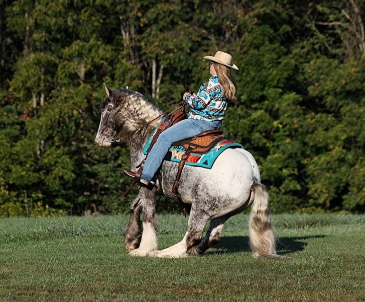 Consigned to Cowgirl Cadillacs in Sheridan, WY. Sales June 14-15th. You can bid online, phone bid or bid in person! Have you been waiting for a knight in shining armor to sweep you away? DANTE STEEL KNIGHT is what you have been waiting for! With a unique roan/appaloosa coat, fluffy feathered legs, poofy mane and tail, loving personality and a heart of gold, even the medieval era did not have a knight like this!!! Over the last year with us Dante has stole the hearts of our little girls! He is Mr. Personality and Mr. Patient! He loves attention and grooming or anything that involves interacting with people! Dante is a well built 15hh, 5 year old, Appaloosa colored, registered Gypsy Vanner gelding! He has a smooth jog, a very nice lope, he reins around and turns a circle both ways, sides passes and backs with ease! Dante knows a trick or two as he lays down for mounting/dismounting. No wonder people love gypsies; their popularity is driven by their versatility and calm nature! Dante is a true ambassador of breed. Dante can go out and ease down the trails. He will cross deep water, rough rocky areas, scale steep slopes and pick his way over deadfall, all while keeping his rider safe! He has been used around the ranch to check cattle, sort pairs and he has roped/doctored calves as well. We have had him down the highways, through town and he is safe around all traffic. He has seen the bright lights and heard the loud speakers as we had Dante in a Christmas play called “Journey Through Bethlehem” which had around 250 actors in it. Dante was ridden as a roman soldier’s horse, for several hours, as he walked up/down rows of car loads of people. Of course folks were taking pictures and reaching out their windows to pet him. Over the 2 nights approximately 8000 cars drove through the “live nativity scene”. We have tested Dante in every way that we know how and he has passed every single test with nothing less than a perfect score! He has shown us that any age and any ability level can enjoy him. If you have been waiting for your knight in shining armor to arrive… HE IS HERE!!! Call 606-308-2461 for more info.