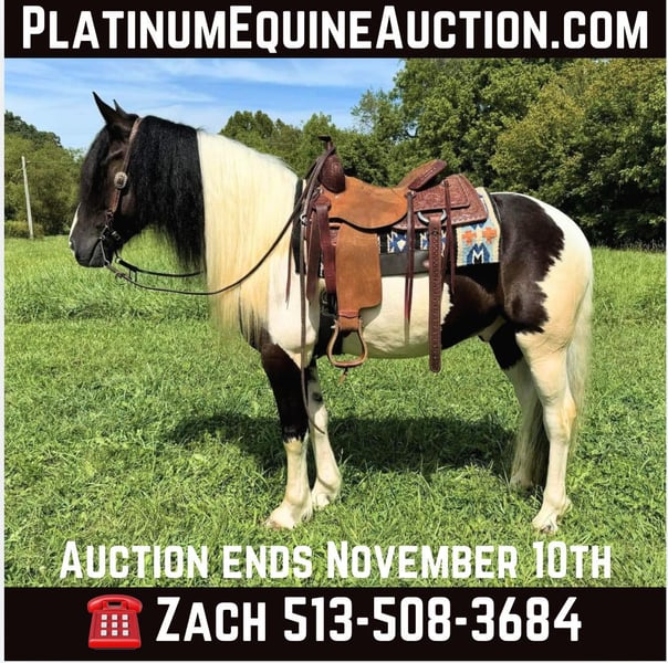 ONLINE AUCTION Place your bids at www.PlatinumEquineAuction.com Starting Bid $3500 Auction ends November 10th, 2024 Need a new saddle? Check out White Rock Saddles on our website or Facebook! Moses a handsome black-and-white paint gypsy cross gelding that is six years old and stance 15.2 hands tall we’ve had this gelding around all summer taking him on several trail rides and enjoying him every chance we can he is a laid-back and gentle horse that is easy to ride, on top of trail riding he has had six months of professional training, which includes desensitizing, laying down on command for mounting as well as dismounting side, passing backing up by using your feet, neck reining, opening and shutting gates. This is a versatile gelding that can take a full days work, whether it be on the trail or the ranch is used to being around cattle and other livestock and never causes any trouble.. nice pretty circles on the correct lead stops on low no matter command he is levelheaded on the trail and will ride for you Point him and he does not care to ride in the front, back or the middle. He talks up quietly and rides off peacefully every time. Located in Grassy Creek, KY. Contact Brandenburg Stables Zach 513-508-3684 with any questions. ONLINE AUCTION Place your bids at www.PlatinumEquineAuction.com Starting Bid $3500 Auction ends November 10th, 2024 Need a new saddle? Check out White Rock Saddles on our website or Facebook!