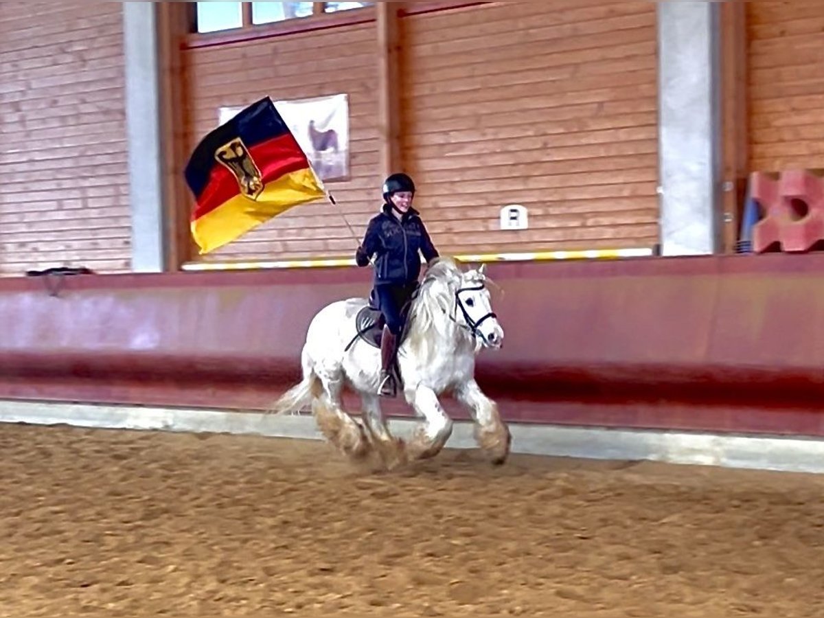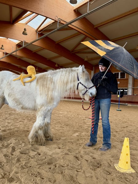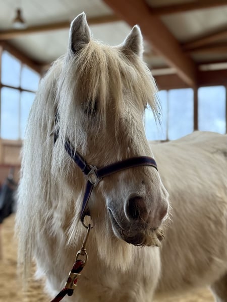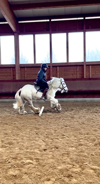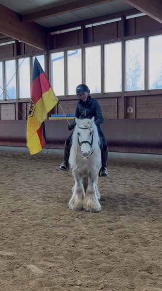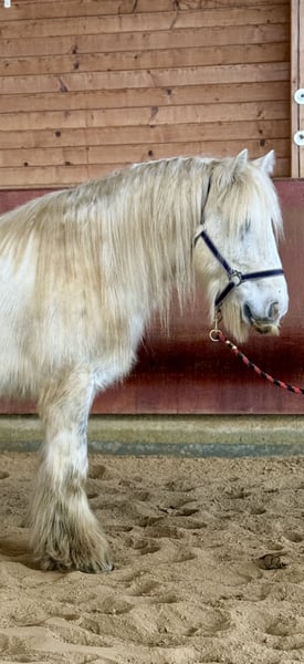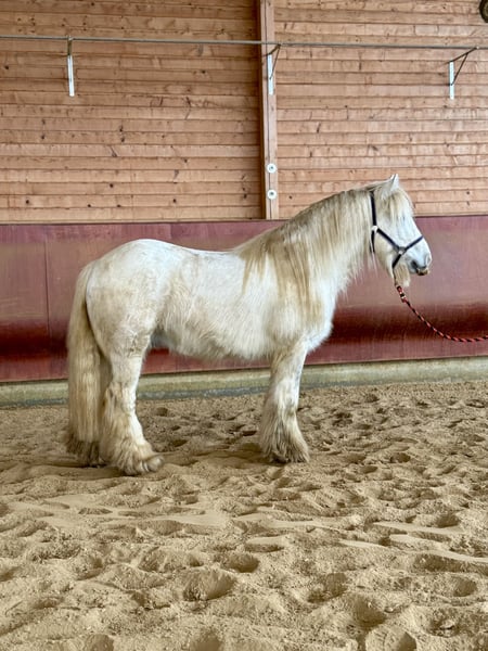 Manche Pferde wachsen einem einfach besonders ans Herz - John ist genau so einer. Geboren 2017, ca. 1,35 m groß, ein echter Irish Cob mit Charme, Charakter und ganz viel Verlässlichkeit. Wir nennen ihn liebevoll „Eisbär" , weil er mit seinem hellen Fell und ruhigen Blick einfach diese sanfte, freundliche Ausstrahlung hat. Und genau so ist er auch im Wesen: ruhig, höflich, neugierig und immer dem Menschen zugewandt. John ist im Herdenverband aufgewachsen und sozial absolut gefestigt. Im täglichen Umgang zeigt er sich vorbildlich. Er ist schmiede- und verladefromm, brav beim Putzen, Satteln und einfach angenehm in jeder Situation. Er liebt Aufmerksamkeit und genießt es, Zeit mit seinem Menschen zu verbringen. Unter dem Sattel geht er sicher in der Bahn. Er vermittelt seinem Reiter ein gutes, sicheres Gefühl und war bereits mit Kindern und Jugendlichen im Gelände unterwegs. Dort zeigt er sich als echtes Verlasspferd. Klar im Kopf, gelassen und zuverlässig. Besonders stolz sind wir auf seine Nervenstärke: Gelassenheitstraining meistert er mit einer Selbstverständlichkeit, die nicht jedes Pferd mitbringt. Die Fahne trägt er problemlos im Schritt, Trab und Galopp ruhig und konzentriert. Auch bei der Stangenarbeit ist er motiviert und aufmerksam bei der Sache. Eine aktuelle kleine AKU ohne Befund liegt selbstverständlich vor. John ist ein ehrlicher Partner fürs Leben. Für Familien, Freizeitreiter oder Kinder und Jugendliche. Ein Pferd, das Sicherheit gibt und gleichzeitig Freude macht.