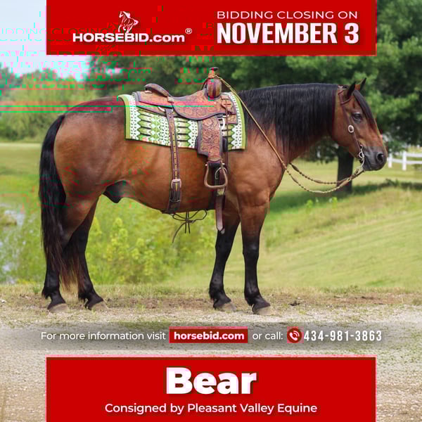 ⚜️𝐓𝐇𝐄 𝐅𝐀𝐋𝐋 𝐇𝐄𝐑𝐈𝐓𝐀𝐆𝐄 𝐂𝐋𝐀𝐒𝐒𝐈𝐂⚜️ Happening now thru MONDAY | NOVEMBER 3rd - Available EXCLUSIVELY on HorseBid's website! For more details and to register visit: www.Horsebid.com CONSIGNOR CONTACT: Pleasant Valley Equine 434-981-3863 LOCATION: Robards, KY BREED: Gypsy / Quarter Horse Cross REGISTERED: No REGISTERED NAME: Bear COLOR: Bay HEIGHT: 14.3 AGE: 9 GENDER: Gelding If your looking for a dependable gelding to hit the trails with, work cattle, jump jumps in a field and maybe even start roping look no further. Let me introduce Bear. After you get to know him he will reminde you of a cuddly teddy 🧸 Bear is picture perfect standing 15.1hh & 1300lbs. He is absolutely one of a kind. Bear has a beautiful thick main and tail and loves to stand for hours to be brushed and braided. You will just fall in love with his great disposition. Bears HISTORY.... Bear was purchased from us 2 years ago. To be a part of small therapeutic program. He is loved & adored. Bear had a calming, relaxing air about him he could calm the most anxious & stressed person. He was rode through flocks of sheep & milking cows. They spent lots of time working on dressage moves in their indoor. His owner has decided to get into Western Pleasure & wants to start showing. They must decrease their herd to make room. Before this Bear lived in Tennessee on an exclusive trail riding resort where he packed well known politicians in the arena & down the trail. These were riders that have never rode before or seen a horse. There not many Gypsy Crosses that ride like this guy. He is more of a push style, but will lope off from a stand still. He has a rocking chair lope and will jog slow and soft. Bear has a one hand neckrein, gets his leads, side pass, will do turnarounds, work a gate, back soft, and he has a huge stop. He will ride away from the barn with no funny business, in big groups, or out alone. He’s seen all kinds of wild life and spent many miles in the fields and woods. He will do all the trail obstacles with no hesitation and an absolute blast to ride. He is great for any level rider young or old. Bear also rides english. He's started going over small jumps and seems to enjoy it. He spent the last couple months working on his Dressage moves. Bear has the best ground manners, is easy to catch in the field, and gets along with other horses. He stands for saddling, bathing, and for the farrier. Currently Bear is barefoot and does not require shoes. He will kindly drop his head to make bridling easy. With just a snap of your finger, Bear will side pass to a picnic table, truck bed, log, or trailer fender to make mounting easy. He’s 100% sound with no vices and up to date on vaccinations. Check out Bear MUST SEE video and make an appointment to day to meet him. ☆Ask about our Gurantee on Bear.