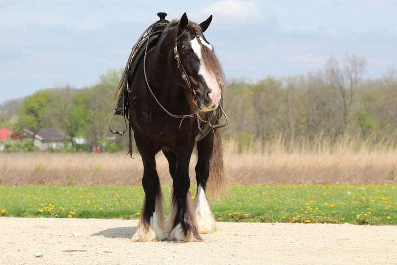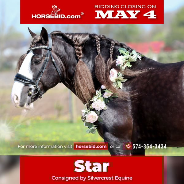 ▪️▫️◾️𝐭𝐡𝐞 𝑴𝒂𝒚 𝐒𝐞𝐥𝐞𝐜𝐭◾️▫️▪️ Happening now thru MONDAY | MAY 4th - Available EXCLUSIVELY on HorseBid's website! For more details and to register visit: www.Horsebid.com CONSIGNOR CONTACT: SilvercrestEquine 574-354-3434 LOCATION: Syracuse, IN BREED: Gyspy Vanner REGISTERED: Yes REGISTERED NAME: Vigorous Charm Star Struck COLOR: Silver Dapple HEIGHT: 14.3 AGE: 9 GENDER: Gelding Looking for a safe , sound uncomplicated and smooth Ride? Star is for you .He is an easy going 9 yr old gelding that has seen it all . Trail rides ,In town for coffee, arena work ; he’s ready and game . Stars jog is extremely smooth and a pleasure to ride . He can lope circles and side pass . Star knows his lead and is responsive to the leg but very tolerant making him suitable for a variety of riders . If you have ever dreamed of competing in the show world , Star would make an excellent choice.Star has nice confirmation ,along with a beautiful crest and would be sure to get the judge’s attention.He would stand quietly in halter making him an excellent jr. horse as well . We could see star making a great youth mount for trail and English under saddle division with his happy ,willing attitude. Star cross logs ,goes through water , is use to dogs , unhinged kids , Nanny the goat ,tractors all the activities at Silvercrest. Trailering is no concern to Star, he loves his bathes and being groomed. He stands great for the farrier , his feet are currently barefoot and he has nice round hooves. Star is quite in his stall and loves turnouts with other horses . He is easy to catch and just and overall good horse . Star is up to date on his spring vaccine and ready for his new Home .He is 14.3 hands tall , and is GVHS Registered.