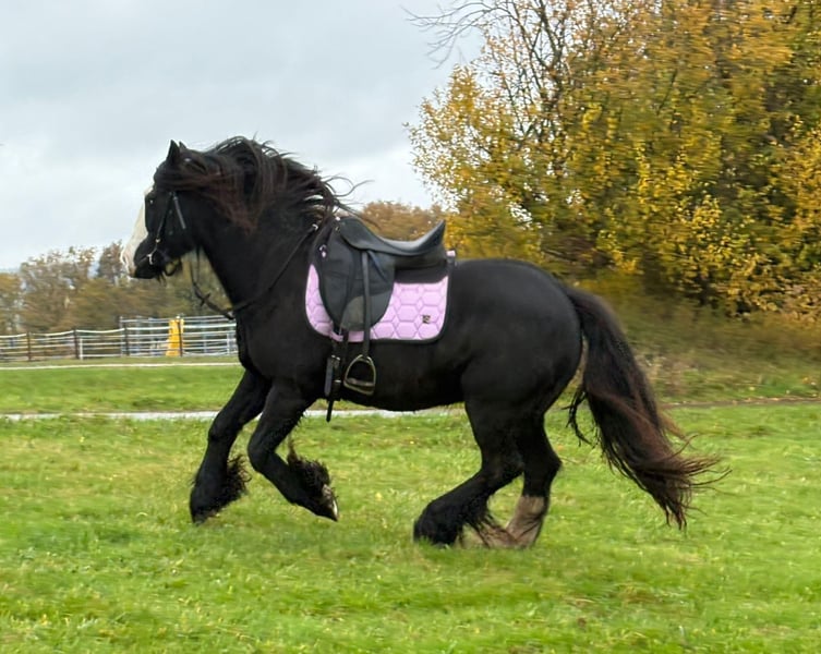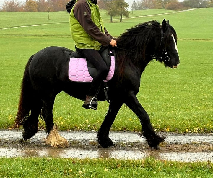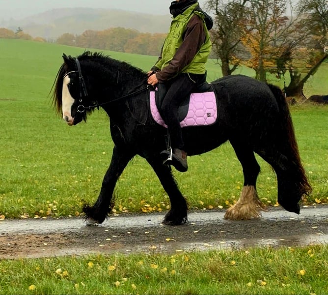 Tinker Mare "Princess" – Calm, Motivated, and a True Treasure We are offering our beautiful, sturdy Tinker mare, "Princess." She is 12 years old, approximately 14.2 hh, and impresses with her loving nature, balanced temperament, and honest character. Princess is an absolute dream to handle. She is friendly, affectionate, and completely reliable—an horse you can trust in any situation. Whether grooming, leading, or picking up her hooves, Princess remains calm, attentive, and gentle. She enjoys every form of affection and genuinely trusts her humans. Under saddle, she is motivated, eager to learn, and responds delicately to the aids. She works willingly, reacts sensitively to the smallest signals, and always aims to please her rider. Whether in the arena, on the riding track, or out on the trail, Princess tackles everything with joy and composure. She rides alone or in a group, separates easily from the herd, and remains consistently confident and dependable. Children can also lead her safely, and she proves to be absolutely well-behaved and secure even in the terrain. She is not a "typical lazy Tinker" but combines the perfect mix of work enthusiasm, nerves of steel, and heart—simply a horse that brings fun and a smile to every day. With her honest nature and gentle demeanor, we see Princess especially well-suited as a family horse or as a partner for a mother-daughter duo. A true heart horse that immediately captures your heart. 📞 For inquiries, please contact us by phone or WhatsApp at +49 1575 1617935. A fee of €30 applies for pre-riding, trial riding, lunging, or grooming, to benefit the horse and protect it from riding tourism. This fee will be deducted from the purchase price if the horse is sold on the same day.