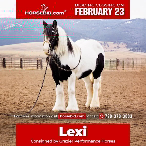 💎 𝐓𝐇𝐄 𝓓𝓲𝓪𝓶𝓸𝓷𝓭 𝐒𝐇𝐎𝐖𝐂𝐀𝐒𝐄 💎 Happening now thru MONDAY | FEBRUARY 23rd - Available EXCLUSIVELY on HorseBid's website! For more details and to register visit: www.Horsebid.com CONSIGNOR CONTACT: Grazier Performance Horses 720-378-3003 LOCATION: Winston, MT BREED: Gypsy Vanner REGISTERED: Yes REGISTERED NAME: Lexlins Iceland COLOR: Black and White paint HEIGHT: 14.1 AGE: 13 GENDER: Mare Lexlin’s Iceland (“Lexi”) – 13-year-old Registered Gypsy Vanner Mare | 14.1–14.2h Lexi is a true all-around Gypsy Vanner built for work and play. Standing 14.1–14.2 hands, she has the temperament, training, and heart to tackle trails, ranch chores, or long days in the saddle. She has a motor, loves covering ground, and can go all day, making her a dependable partner on any ranch. Calm and consistent, Lexi stands like a rock for grooming, bathing, and saddling, and loads into the trailer effortlessly. Big, solid feet and a sturdy build mean she holds up to thousands of miles with ease. Handy, versatile, and easy-going, she’s the kind of mare every barn wants. Under saddle, she offers a smooth walk/trot/canter, rides one-handed, backs easily, and side passes both directions to open gates. Sure-footed and confident over hills, obstacles, and new terrain, Lexi is ready for whatever the day brings. Built to last, talented, and a joy to ride, Lexi is the complete package! Please reach out with any questions or to set up a visit! Located in Winston, MT. Call Austin Grazier 720 378 3003 with any questions.