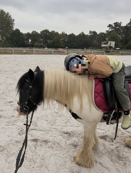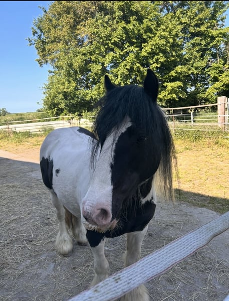 We are looking for a loving home for our Tinker pony, Rainbow, affectionately called "Tinki." Tinki is 15 years old, approximately 1.35 meters tall, and has a sturdy build that allows her to cover well. She is regularly vaccinated and dewormed, stands well for loading and farrier work, and is barefoot. At our stable, she stays in a box at night, but we can also imagine her in a paddock system. No health issues are known, and during her time with us, she has had no health problems. As is typical for her breed, Tinki occasionally develops mild mud fever, which is easily managed with regular hoof care. Feeding-wise, Tinki is uncomplicated. She mainly receives hay, along with some muesli and minerals. Tinki is an intelligent, affectionate, and lively pony that needs to be motivated, exercised, and engaged, as well as a consistent handler. She has a very friendly and loving nature but sometimes tests boundaries in a "pony manner," so she is only conditionally suitable for complete beginners. In our care, Tinki has been primarily used for pony leading, Hippolini lessons with small children, groundwork, and riding lessons. She has also shown skill and talent during pole work and small jumps. Her previous owners participated her in lead-rein competitions, and she is a reliable partner for pony rides at children's or village festivals. Tinki is being sold with bridle and saddle (included in the price). We only place her in the best hands, as she is unfortunately not mentally or physically challenged enough in our care, and we cannot meet her needs adequately. For further questions and videos, please feel free to contact us. €4,000 including saddle and bridle