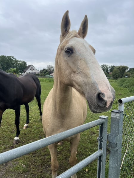 Our beautiful Palomino Tinker mare (approximately 1.50 m tall, with passport) is looking for a loving home where she can simply be a horse. I originally bought her as a riding and companion horse for my daughter. Unfortunately, it has become clear that she gets very nervous and tense under saddle and is therefore not suitable as a riding horse. She is also insecure while walking and needs experienced hands. In stable life and during grooming, she is uncomplicated and friendly. She has already had foals and is very well suited for breeding due to her special Palomino coloring. She is also well suited as a companion horse in a herd. She is sensitive to dust but currently shows little to no symptoms as long as her care takes this into account (e.g., open stable, steamed hay, or low-dust feeding). Price upon request / negotiable. It is important to me that she goes to a home where she can enjoy her last years in peace and where her needs are taken into consideration.