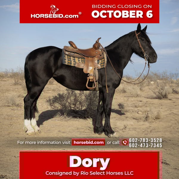 🍂 𝓐𝓾𝓽𝓾𝓶𝓷 𝑨𝑳𝑳 𝑺𝑻𝑨𝑹 𝑳𝑰𝑵𝑬𝑼𝑷 🍂 Happening now thru MONDAY | OCTOBER 6th - Available EXCLUSIVELY on HorseBid's website! For more details and to register visit: www.Horsebid.com CONSIGNOR CONTACT: Rio Select Horses Llc 602-783-3528 602-473-7345 LOCATION: Tonopah AZ BREED: Gypsy Vanner Friesian Cross REGISTERED: No COLOR: Black HEIGHT: 14.3 AGE: 4 GENDER: Mare Dory, a Gypsian Mare with a truly kind heart, was born and raised on our ranch. She’s been around kids and other animals and gets along with everyone! Dory has been used for trails and really enjoys it. She’s also been exposed to chaotic environments like barking dogs, trash trucks, and heavy traffic. She loads, unloads, and travels well. Dory stands tied and also stands for the farrier. She’s elegant and has really nice ground manners. For more information on Dory, don’t hesitate to call or text @ 602-783-3528 or 602-473-7345. We’re more than happy to answer any questions or schedule any appointments to meet Dory. We can help and arrange hauling